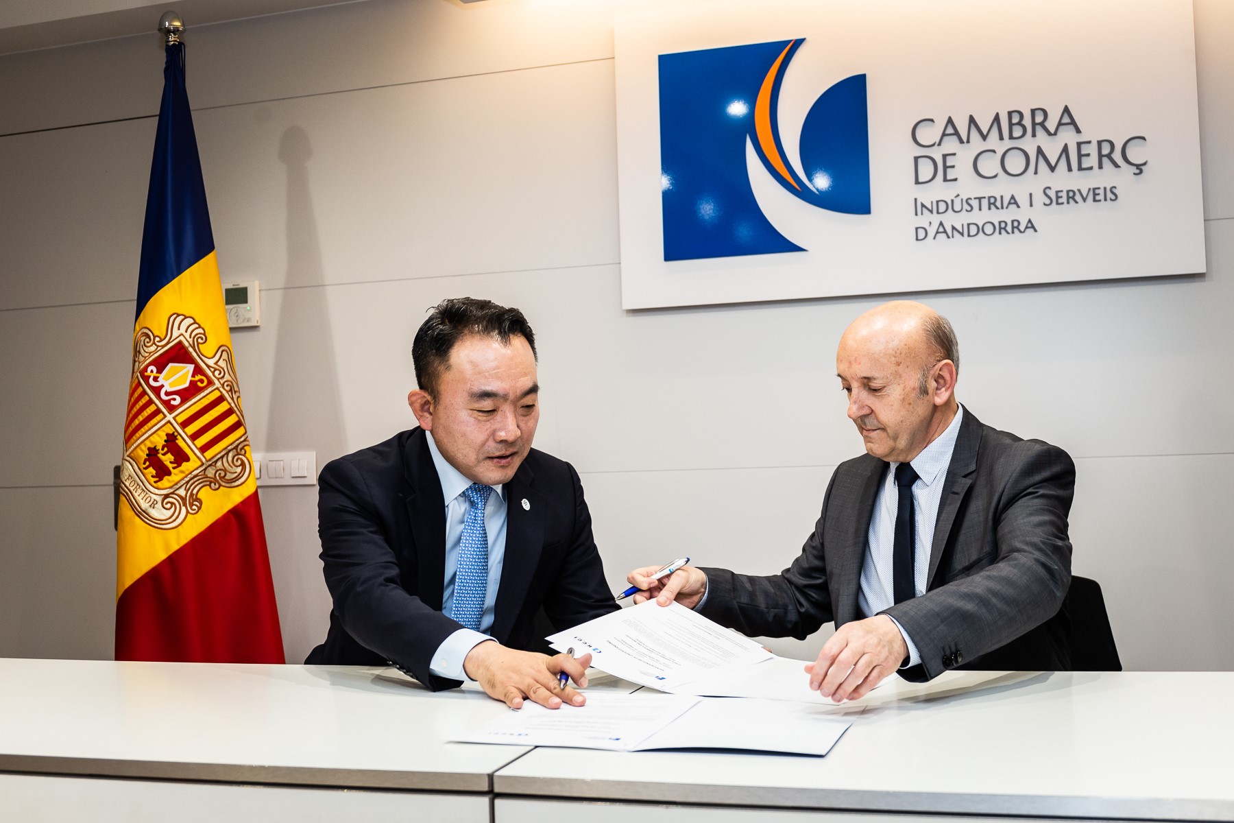 El president de la Cambra de Comerç, Indústria i Serveis d’Andorra (CCIS), Josep Maria Mas, i el vicepresident de la Cambra de Comerç i Indústria de Corea del Sud, Seong Woo Lee, han signat avui un memoràndum d’entesa (MOU) amb l’objectiu de promoure les relacions entre els empresaris d’ambdós països. La formalització d'aquest acord de bones intencions es fa amb la voluntat que aquesta signatura suposi establir un primer contacte empresarial entre les dues entitats, segons han informat des de la CCIS.