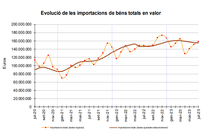 Durant els primers set mesos de l’any 2023, el total d’importacions és de 1.044,14 milions d’euros, amb una variació percentual del +7,8% respecte al mateix període de l’any anterior. Els grups amb una major variació positiva són: “Transport” (+29,6%), “Alimentació” (+13,3%), “Diversos” (+19,3%), “Farmàcia-perfumeria” (+15,7%), “Electrònica” (+11,8%) i “Vestit i calçat” (+10,9%). Per contra les partides amb una variació negativa més destacada són “Energia” (-21,7%) i Construcció” (-4,7%).