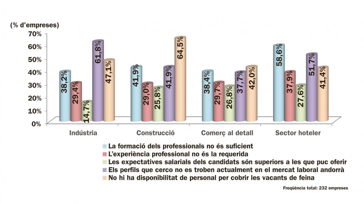 Les dificultats que tenen les empreses per trobar mà d’obra qualificada s’han convertit ja en una de les cinc principals preocupacions de les empreses del país. De fet, durant el 2022 més de la meitat de les companyies (53,6%) enquestades per la Cambra de Comerç, Indústria i Serveis (CCIS) han tingut problemes per cobrir les vacants. El sector de la construcció és qui n’ha patit més les conseqüències i 9 de cada 10 enquestes afirmen que tenen dificultats de contractació; gairebé al mateix nivell que l’hoteleria, on 8 de cada 10 diuen estar afectades per la falta de personal qualificat.