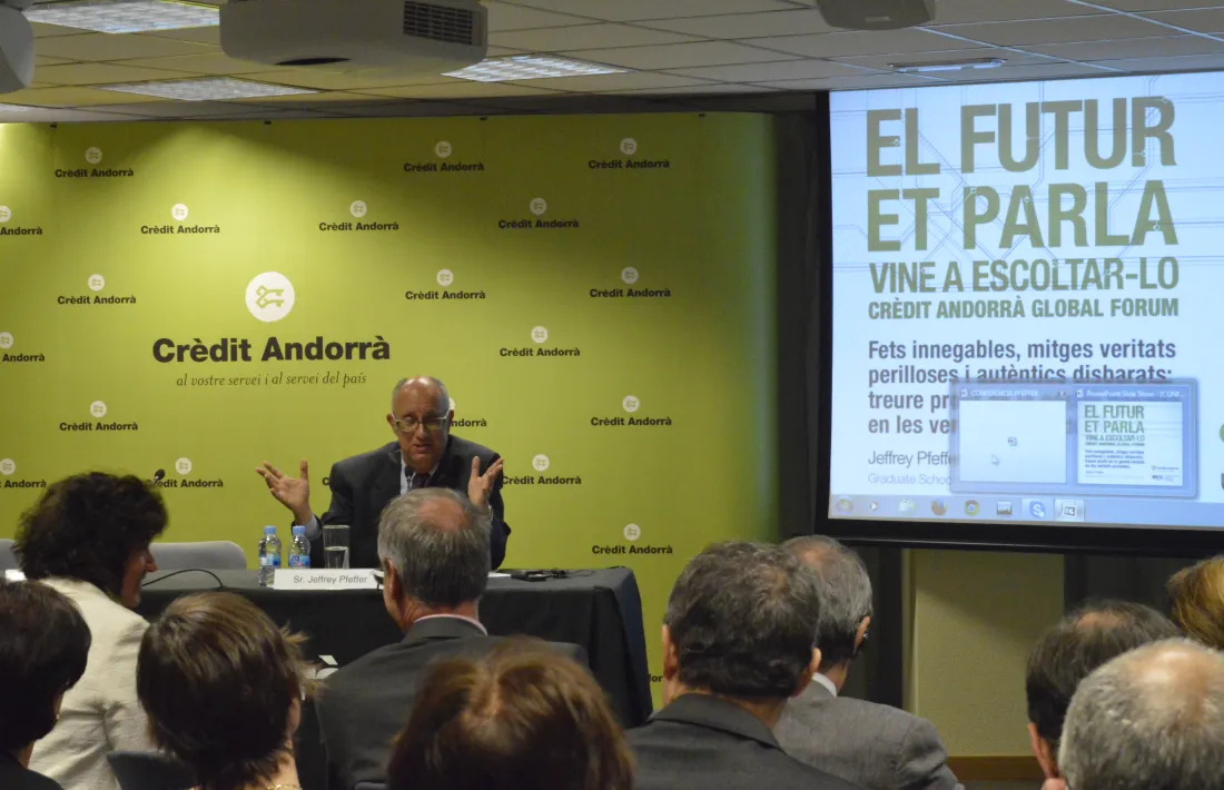 El professor Jeffrey Pfeffer, de la càtedra Thomas D. Dee a l’escola de management de la Universitat de Stanford i professor visitant de l’IESE, va ser ahir el primer ponent convidat del cicle de conferències Crèdit Andorrà Global Forum. Aquesta nova iniciativa de la càtedra Crèdit Andorrà de mercats, organitzacions i humanisme de l’IESE pretén oferir una anàlisi del futur i les tendències globals en diferents sectors com l’econòmic, l’educatiu, el sanitari, l’energètic i el turístic, entre d’altres.