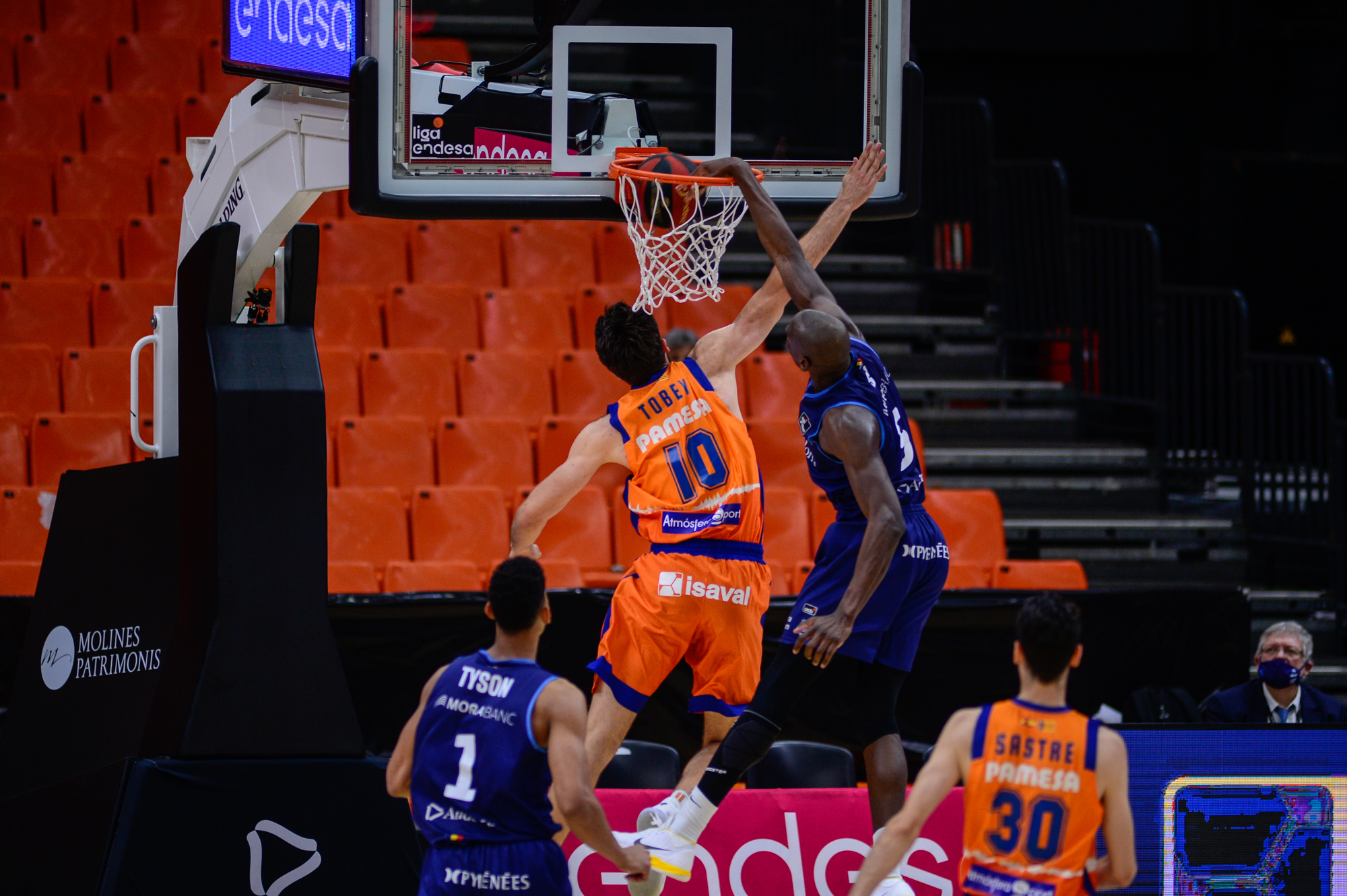 A només set minuts de la mascletà. Quedaven 7’38” per acabar el partit quan Clevin Hannah va anotar una safata espectacular per situar el 69 a 70. Només un punt de diferència i completant un parcial de 9 a 0, però una pèrdua de Dejan Todorovic per manca de concentració en una passada estrepitosa de David Jelínek i un triple fallat pel mateix jugador serbi va ser aprofitada pel València Basket per passar del 69 a 70 al 69 a 77. A partir de llavors, els de Jaume Ponsarnau, molt més sòlids, van clavar un parcial de 3 a 20 per deixar el 72 a 90. Per tant, així es va forjar la primera derrota del BC MoraBanc en l’estrena de la fase final excepcional de l’ACB que es disputa a València. Els de Navarro, sense els seus dos pivots: Moussa Diagne i Dejan Musli, van perdre per 74 a 90 contra l’equip amfitrió, el València Basket. L’aler gallec Alberto Abalde va anotar 17 punts i va valorar 25, convertint-se en el clar botxí dels de Navarro.