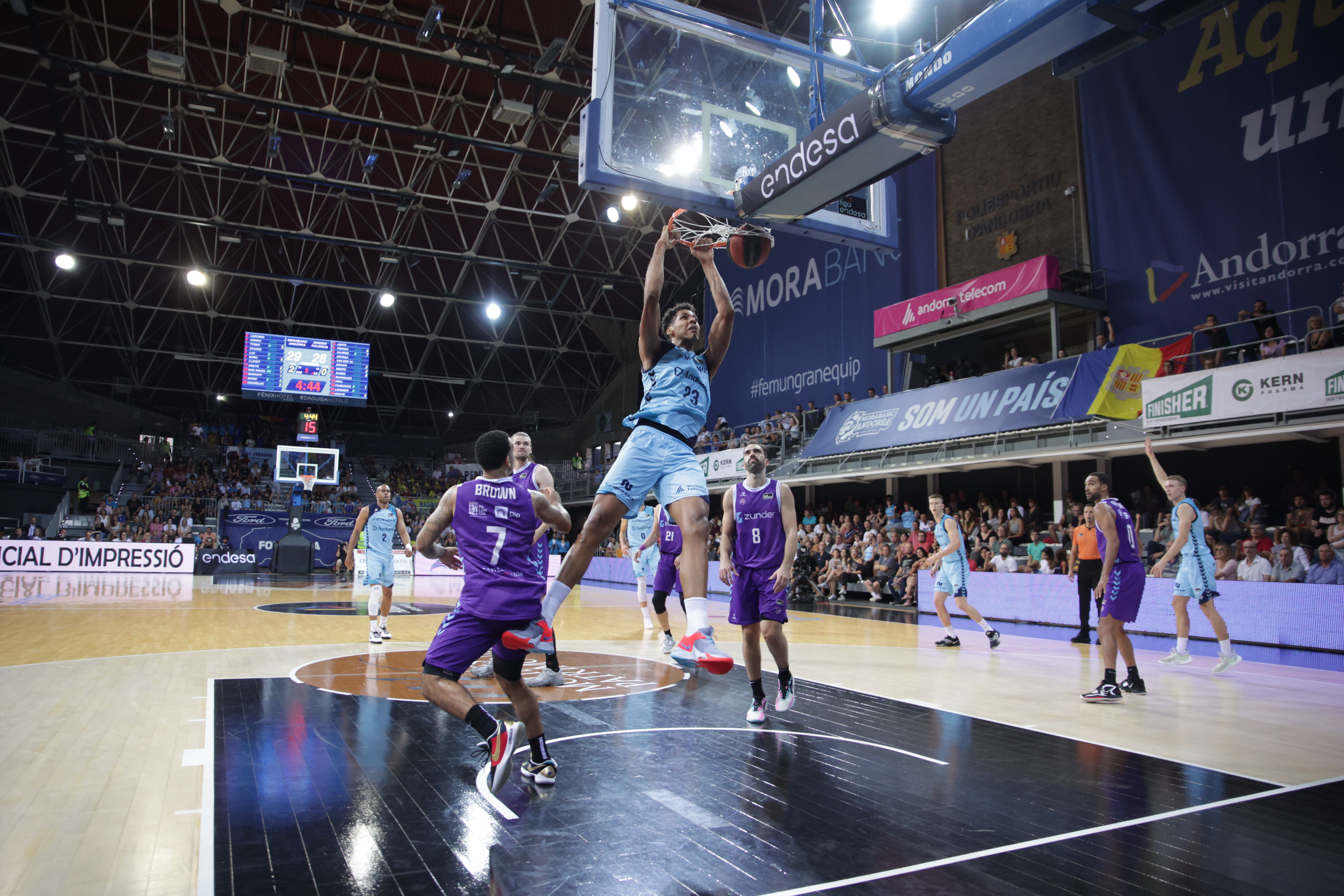 Reedició del duel del curs passat, però transportat a l’ACB. El BC MoraBanc i el Zunder Palència van recordar temps passats, més recents que distants, en un encontre que va arribar a la tercera jornada. Molt aviat per tenir les primeres urgències, però els de Natxo Lezkano van realitzar una millor posada en escena conscients de la importància d’alimentar l’autoestimada danyada. Dos Anjos va liderar el parcial inicial de 10 a 3 amb els cinc primers punts. Marco Justo, tècnic canari del Zunder Palència, va demanar temps mort i va fer canvis donant entrada a Haarms, Van der Vuurst, N’Diaye, Yannick Franke –exMoraBanc– i Kamba. L’entrada d’aquests jugadors va bloquejar als de Lezkano i va activar als de Justo que van fer un parcial de 4 a 10 per situar-se per primer cop per davant en l’electrònic (14 a 17). Els dos triples seguits de Franke van ser decisius. Marin Maric, amb quatre punts consecutius, va despertar al BC MoraBanc, però els punts a la pintura de Haarms van tancar el primer quart amb un 20 a 21 desfavorable.
