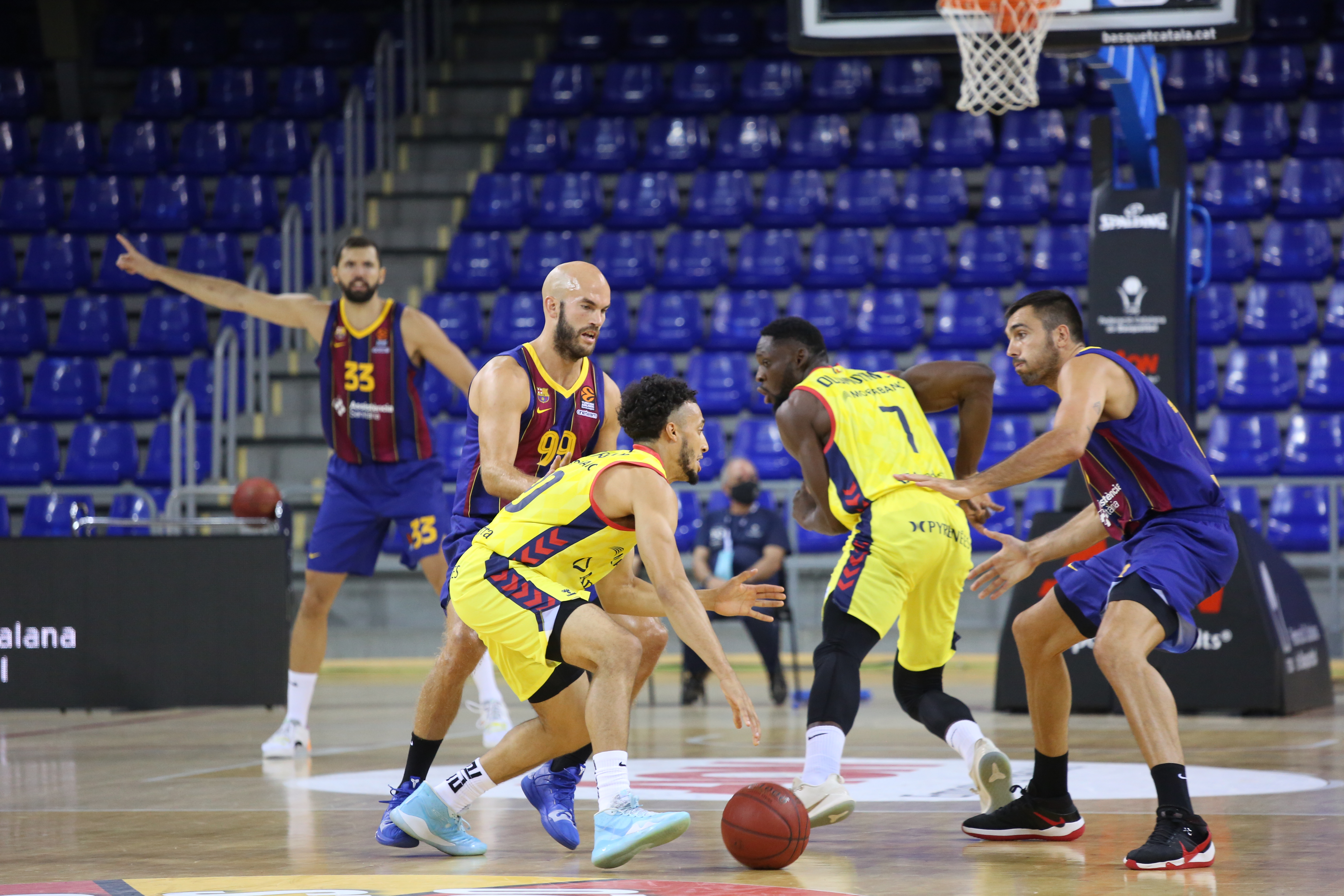 El tècnic del BC MoraBanc, Ibon Navarro, va necessitar demanar un temps mort només començar després d’un parcial d’11 a 5 de l’FC Barcelona. Els de Saras Jasikevicius van començar el partit amb un ritme molt alt i un joc de moltes passades ràpides gairebé sense vot la gran majoria. Els sis primers punts del jove base argentí Leandro Bolmaro i els dos primers punts de Nikola Mirotic van provocar l’enuig de l’entrenador basc. De l’11 a 5 inicial a favor dels blaugrana es va passar, amb un parcial de 2 a 8, a l’empat a 13 destacant un alley-hoop de Tyson Pérez després d’una assistència de Sergi García. El bon paper dintre de la pintura del senegalès Malik Dime amb sis punts seguits va tancar un segon quart amb un 17 a 15 per als de Saras.
