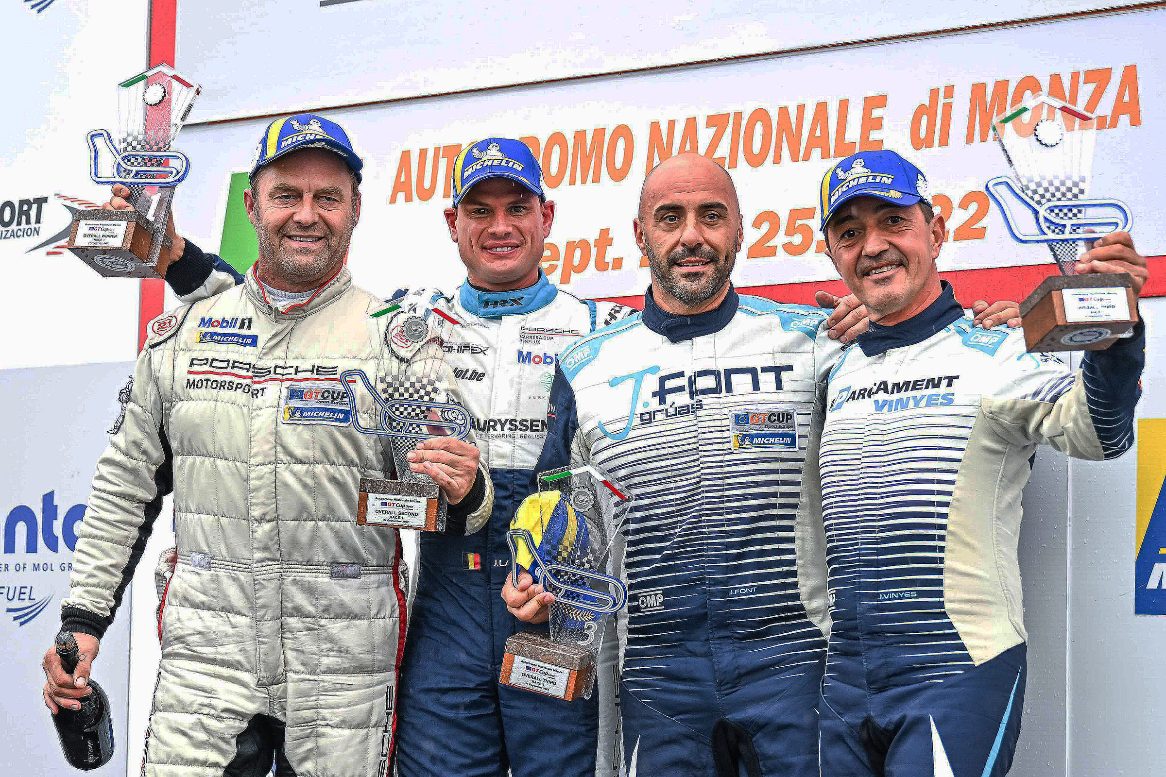 Tercera posició per a Joan Vinyes i Jaume Font (Porsche 992 GT3 Cup) al míting de la GT Cup Open Europe disputat el passat cap de setmana a l’Autòdrom Nacionale de Monza (Itàlia). Va ser un doble podi, és a dir, un doble tercer lloc, ja que dissabte també van assolir la mateixa posició. “Hi ha hagut moments complicats. La pluja sempre t’exigeix més al volant. Hem competit bé i la prova d’això són els dos podis. Content amb l’experiència que ha estat una excel·lent preparació”, va dir Joan Vinyes.