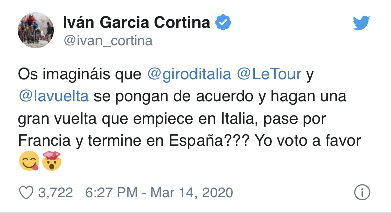 El ciclista resident del Bahrein Mérida, Iván García Cortina, recentment guanyador de la tercera etapa de la París-Niça, ha deixat anar una peculiar idea a través de les seves xarxes socials. Una proposta que no ha deixat a molta gent del món del ciclisme indiferent. "Us imagineu que el Giro d'Itàlia, el Tour de França i la Vuelta a Espanya es posin d'acord i facin una gran volta que comenci a Itàlia, passi per França i acabi a Espanya? Jo voto a favor", va escriure el ciclista asturià que viu des de fa un any llarg a La Massana. De fet, el Giro d'Itàlia ja va decidir posposar la seva edició per l'impacte de la pandèmia a Itàlia. Per la seva banda, la Unió Ciclista Internacional (UCI) ha anunciat mesures davant la crisi del Covid-19. Per tant, congelarà les classificacions i rànquings, almenys, fins al 3 d'abril i les classificacions encara obertes per els Jocs Olímpics de Tòquio 2020 (BMX i paralímpics de carreteres) es detenen retroactivament en la data del 3 de març.