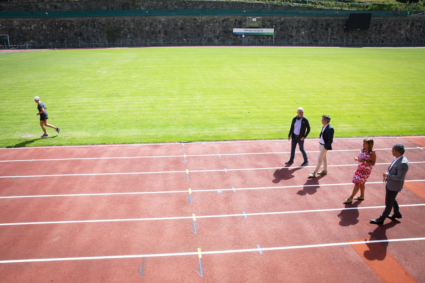 Conxita Marsol, cònsol major del Comú d’Andorra la Vella, David Astrié, cònsol menor, Alain Cabanes, conseller d’Esports i de Joventut, i Marc Magallón, cap d’àrea d’equipaments esportius, van visitar ahir al matí la instal·lació per comprovar in situ l’estat de millora de la pista d’atletisme.