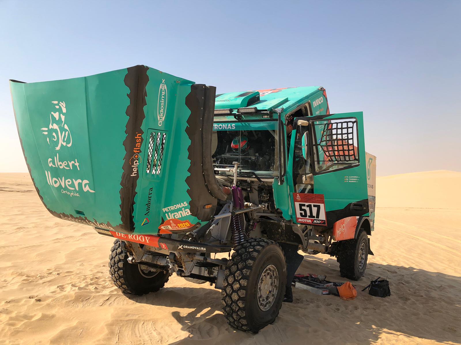 El turbo de l’Iveco del Team de Rooy-Petronas, que pilota Albert Llovera, va dir prou, però el pilot andorrà continua en el Top-15 de la classificació general del Ral·li Dakar que es disputa a l’Aràbia Saudita. L’equip format per Albert Llovera, Marc Torres i Ferran Marco van creuar la meta en 31è lloc i amb un retard de gairebé quatre hores (3 h 40’23”) respecte al primer classificat, Antyon Shibalov. “La cosa sembla greu, però sortirem d’aquesta. Marc Torres i Ferran Marco estan treballant com a jabatos per solucionar el problema. Estic ansiós per tornar a donar gas i intentar recuperar, almenys en part, el temps que hem estat aquí aturats”, va assegurar Albert Llovera, que avui afrontarà el final de l’etapa marató, l’onzena del Ral·li Dakar. El final del raid més dur del món s’apropa.