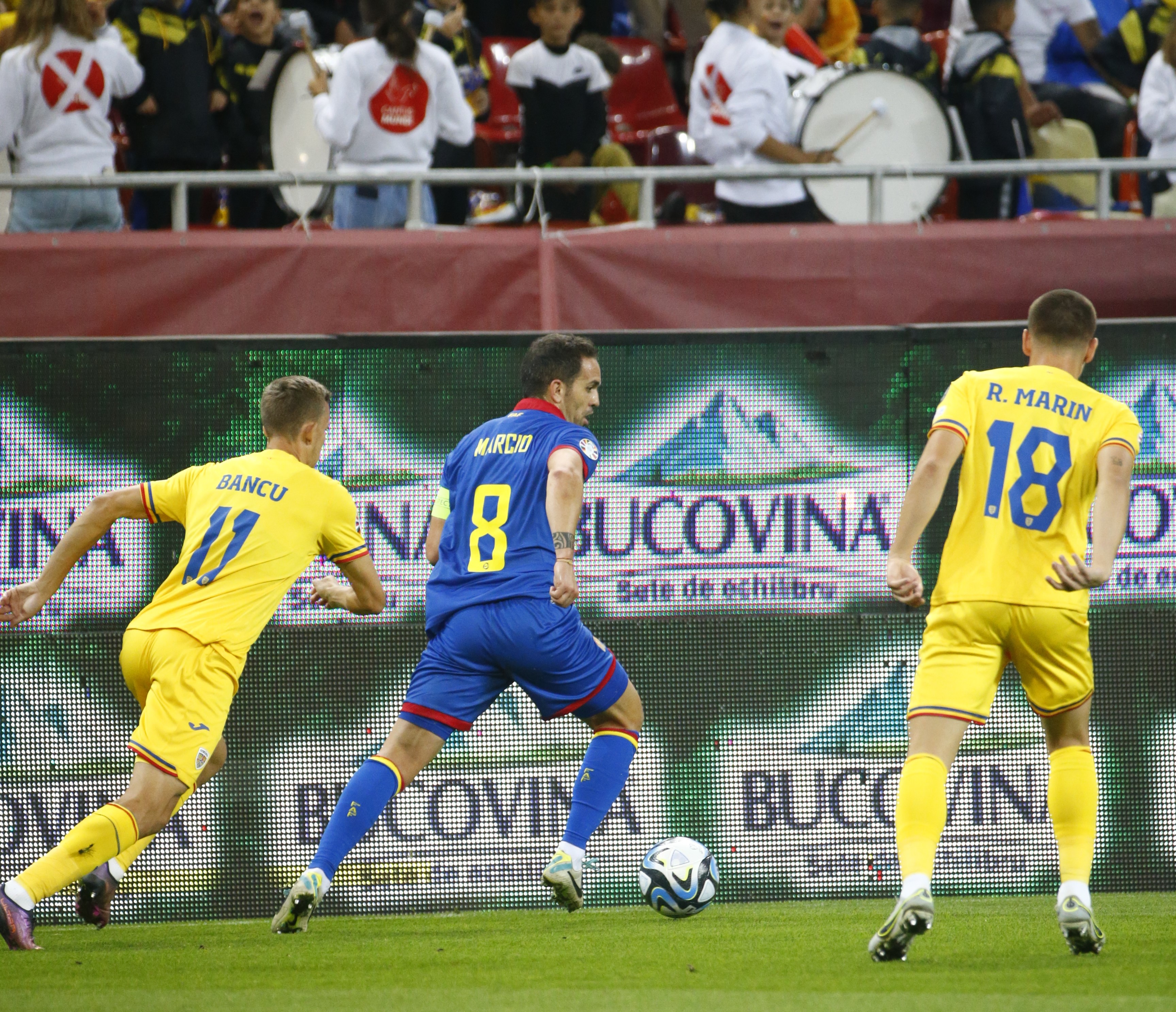 Totalment superats, el combinat dirigit per Koldo Alvarez de Eulate va estar entregat davant d’una Romania molt superior. Al minut 41, Marc García va caure al parany d’Ianis Hagi. El migcampista, fill de Gica Hagi, conegut com el Maradona de los Cárpatos, va donar dues empentes lleus per guanyar la posició i Marc García va respondre amb una de més forta. L’àrbitre estonià, avisat per l’assistent, va xiular penal i des del punt fatídic va marcar Razvan Marin. Amb el 3 a 0 es va arribar al descans i Andorra va oferir ben poc com també acostuma a passar. El jugador de l’Empoli és fill d’un altre mític, Petre Marin, més conegut com a Jair.