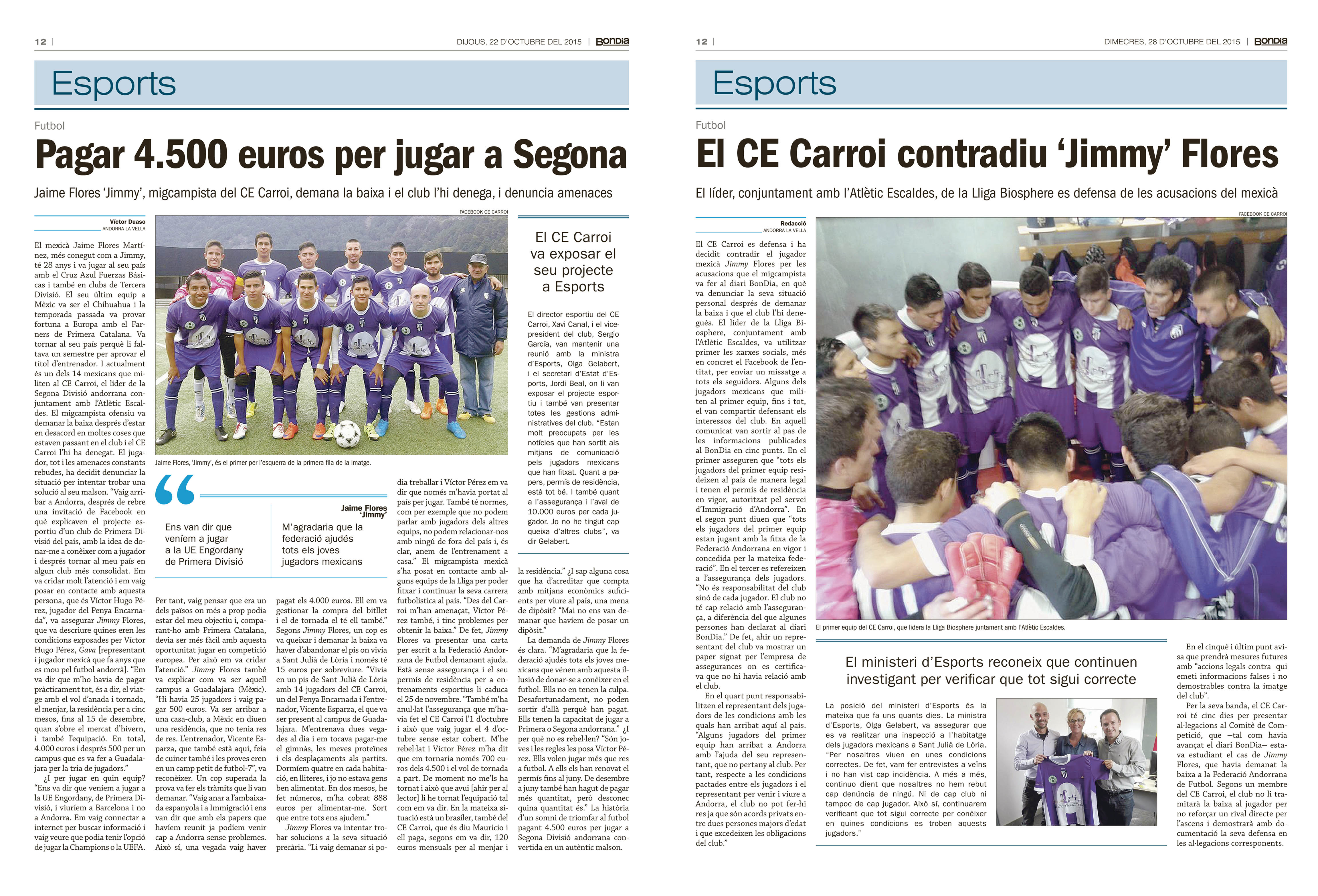 Una vegada superada la prova i quan va arribar a Barcelona, li van dir que viuria allà i no al Principat. I després que no jugaria a la UE Engordany de primera, sinó al CE Carroi de segona divisió. Finalment va viure a un pis de Sant Julià de Lòria amb 14 jugadors més del seu país que militaven al CE Carroi, un del Penya Encarnada i l’entrenador també mexicà que de retruc els feia de cuiner. Jimmy explicava llavors que dormien quatre en la mateixa habitació. Un cop va fer pública la seva situació al BonDia va denunciar amenaces i va intentar solucionar-ho a través de la Federació Andorrana de Futbol per obtenir la baixa. A més, el seu permís de residència va caducar i li van anul·lar l’assegurança. Un viacrucis. I no només, sinó també altres.