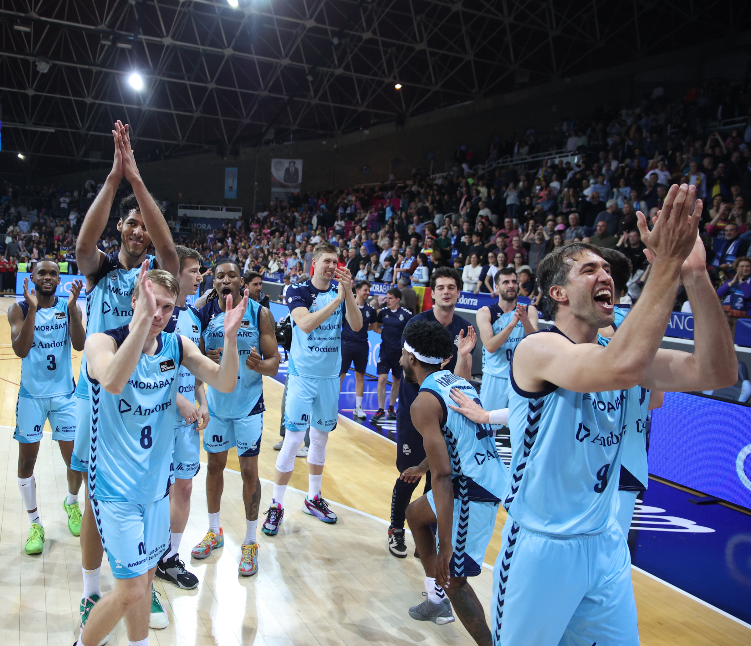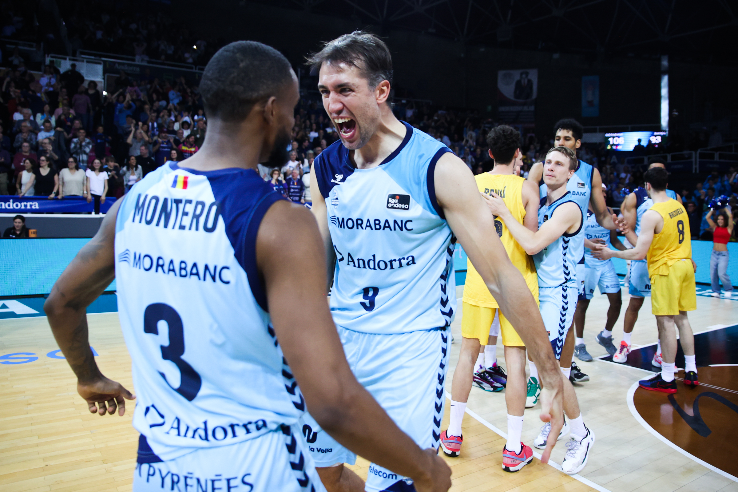 Premi a la paciència. Premi a la confiança en l’entrenador que et va portar fins aquí i també premi a uns jugadors, molts d’ells procedents del projecte de la LEB Or. El BC MoraBanc, a tres jornades per al final, sumarà el curs vinent la 14a temporada a la màxima competició del bàsquet espanyol. Assolit el primer objectiu principal, però encara queda un altre. L’entitat presidida per Gorka Aixàs i liderada des de la banqueta per Natxo Lezkano vol tornar a disputar competició europea. Per tant, la 12a posició és el segon objectiu de la temporada. I ara queden tres finals: una a Santiago de Compostel·la, una altra a Lugo i la del Poliesportiu d’Andorra contra el València Basket. I tot plegat després d’imposar-se al Barça en un festival ofensiu, amb un espectacular 108 a 92. Festa grossa i amb vells coneguts del descens a LEB Or, com Óscar Quintana –comentarista a Movistar– i Oriol Paulí –actualment al Barça–. I també un altre vell conegut. Un que no va deixar massa amics per aquí: Víctor Sada. Ara forma part del cos tècnic de Roger Grimau. Més d’un es va recordar d’ell i la seva frase: “És un club d’amics”.