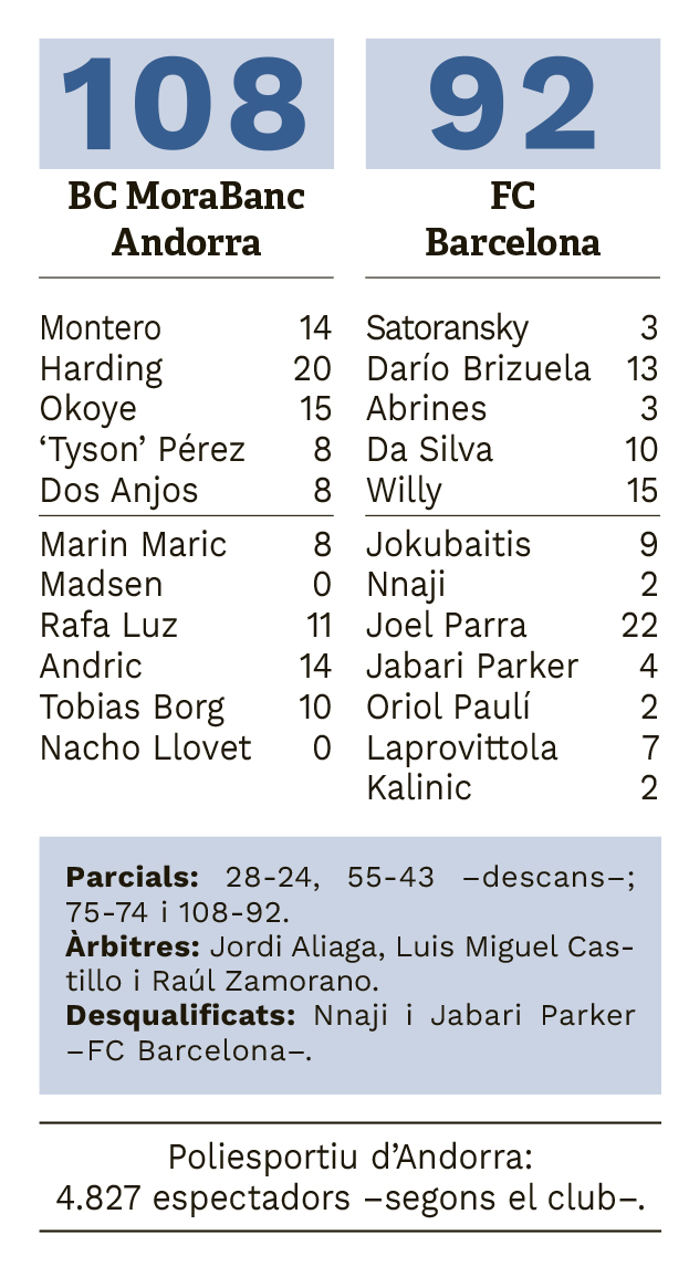 108- BC MoraBanc Andorra: Montero (14), Harding (20), Okoye (15), 'Tyson' Pérez (8) i Dos Anjos (8) –cinc inicial–; Marin Maric (8), Madsen (0), Rafa Luz (11), Andric (14), Tobias Borg (10) i Nacho Llovet (0).