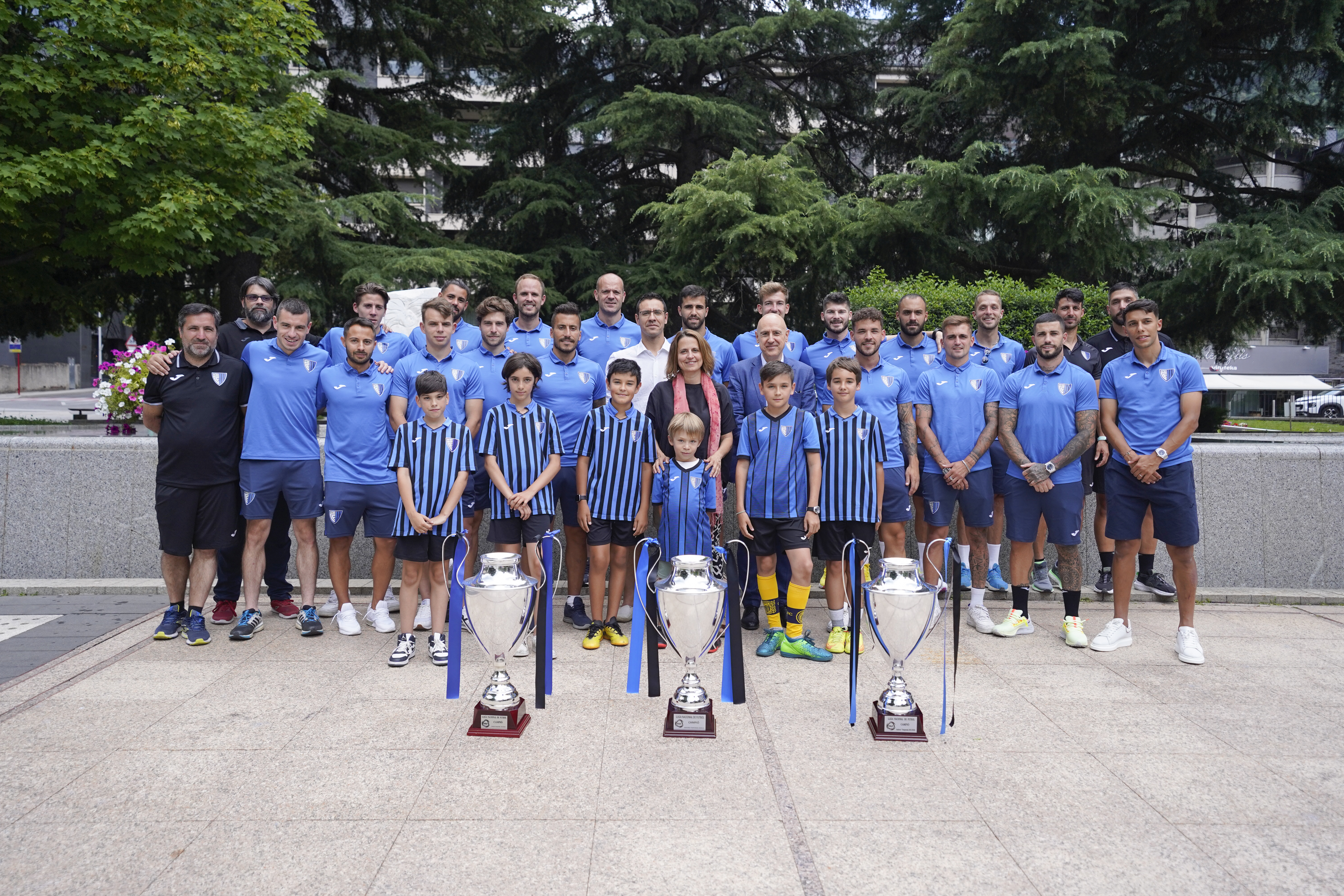 La Cònsol major del Comú d’Escaldes-Engordany, Rosa Gili, va liderar ahir una trobada amb la plantilla del primer equip de l’Inter Club Escaldes i també alguns representants de l’escola de l’entitat. La plantilla, dirigida per Otger Canals des de la banqueta, va fotografiar-se amb els tres títols de lliga. El club escaldenc va entregar una samarreta al Comú.