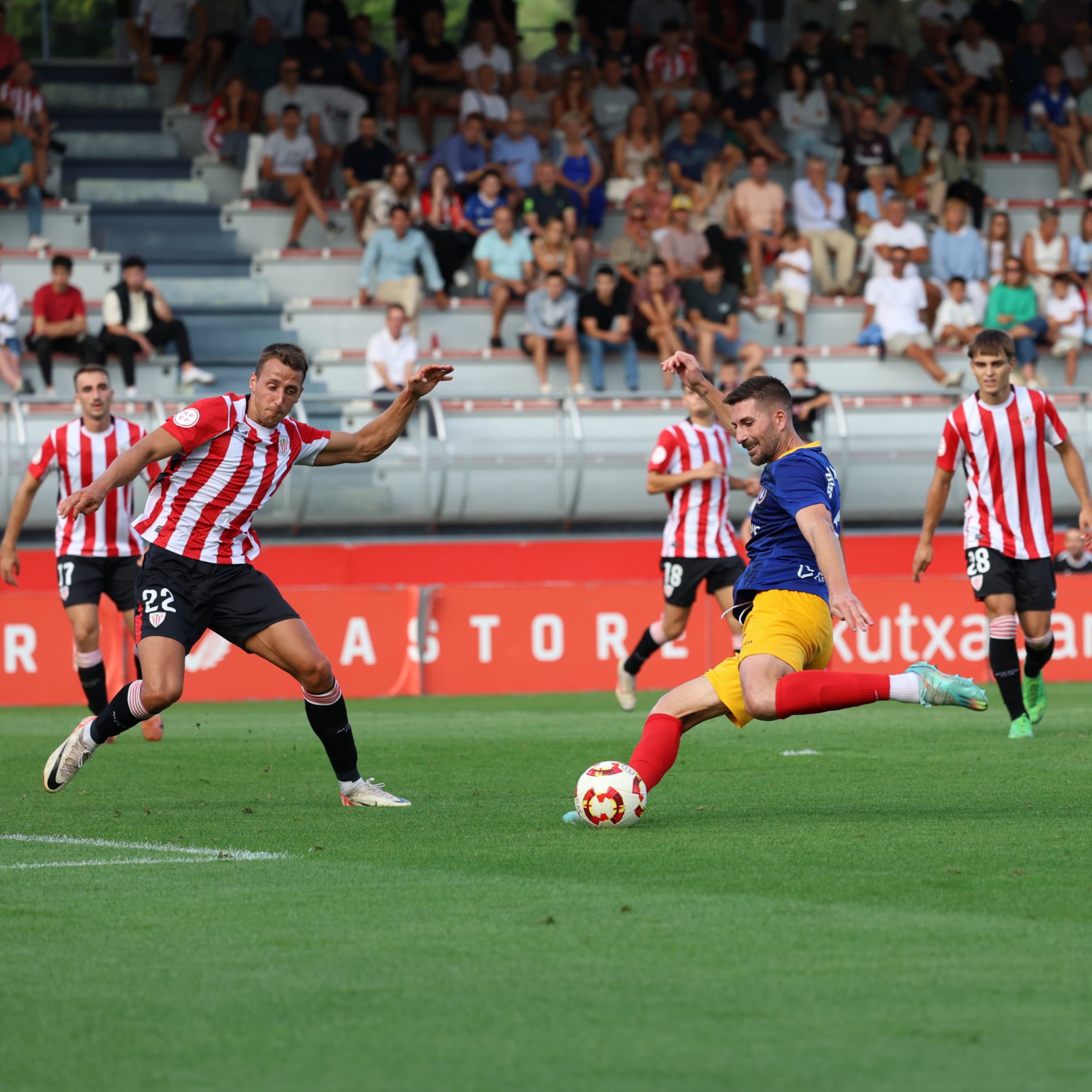 A la represa, l’entrada de Josep Cerdà per Joel Arumí va ser clau. El ritme del partit va canviar i les ocasions clares van arribar. Al minut 50, Mikel Santos –format al Danok Bat– va evitar en primera instància el gol d’Álvaro Martín i en segona, a boca de canó, de Lauti De León. Després, Solís va enviar un xut al pal i també va perdonar César Morgado, tot sol, enviant la pilota per sobre del travesser. Els canvis de Jokin Aranbarri van arribar un xic tard, però van tornar a canviar el partit. Al minut 75, Xabi Irurita, un altre ex-Osasuna, va rematar sol de cap fluix a les mans de Nico Ratti. Un minut després, Azkune, al més pur estil Messi, és a dir, driblant als rivals com si res es va topar amb un encertat Nico Ratti. Aquesta aturada va salvar la sentència d’un Bilbao Athletic que va acabar més sencer el partit en tots els sentits. I al minut 94, Morgado, molt lent, va fer falta sobre Igor Oyono –aquest estiu l’Athletic Club va pagar més 10 milions d’euros per ell al Vila-real– quan marxava sol i va ser expulsat. El pròxim partit, contra el Barça Atlètic.