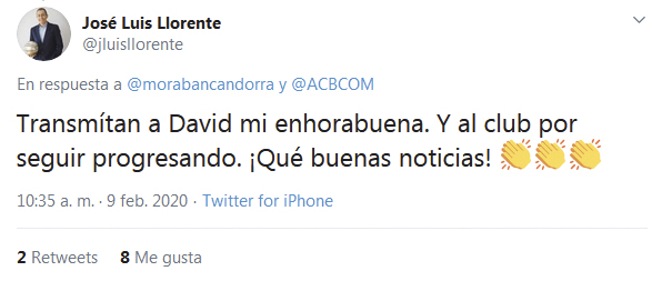 Jelínek va rebre la felicitació a través de les xarxes socials de l’exbase del Festina Andorra i també del Reial Madrid. “Transmetin a David la meva enhorabona i al club per continuar progressant. Quines bones notícies!” I també del president del club, Gorka Aixàs: “Un dels nostres i des d’avui història activa del club. DJ Forever. Per molts més partits”. Els números de David Jelínek en aquests 121 partits són aquests: 19,16 minuts per partit amb 9,22 punts amb 6,37 de valoració.