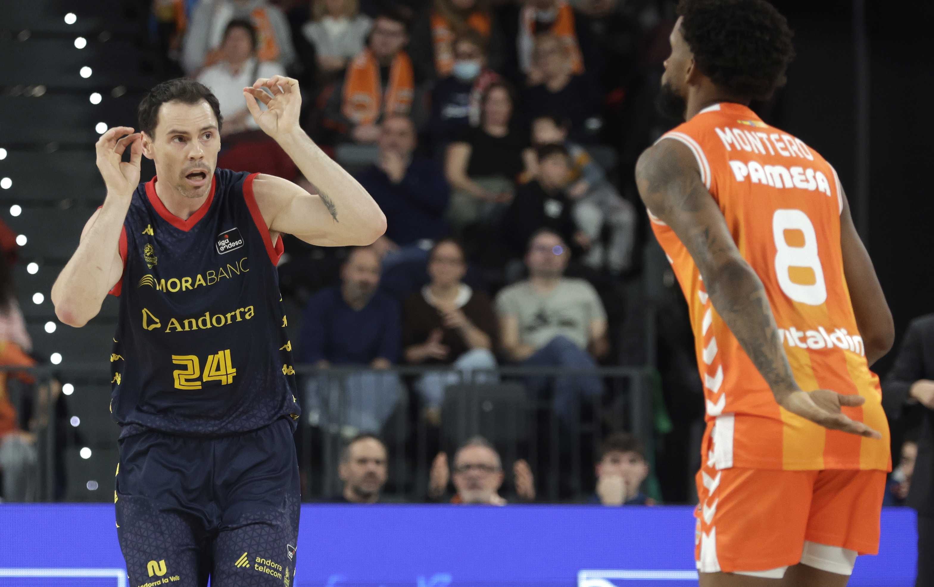 El BC MoraBanc va demostrar a València, almenys durant els dos primers quarts, que no trien partits i que competeixen contra qualsevol rival. El parcial d'inici va ser de 4 a 12 amb un Kyle Kuric molt inspirat des de l'exterior. Els valencians es van fer un fart de fallar triples amb un 0 d'11 fins al primer encert de Jean Montero. Una cistella sobre la botzina d'esquenes de Badio va tancar el primer acte amb un 18 a 16.