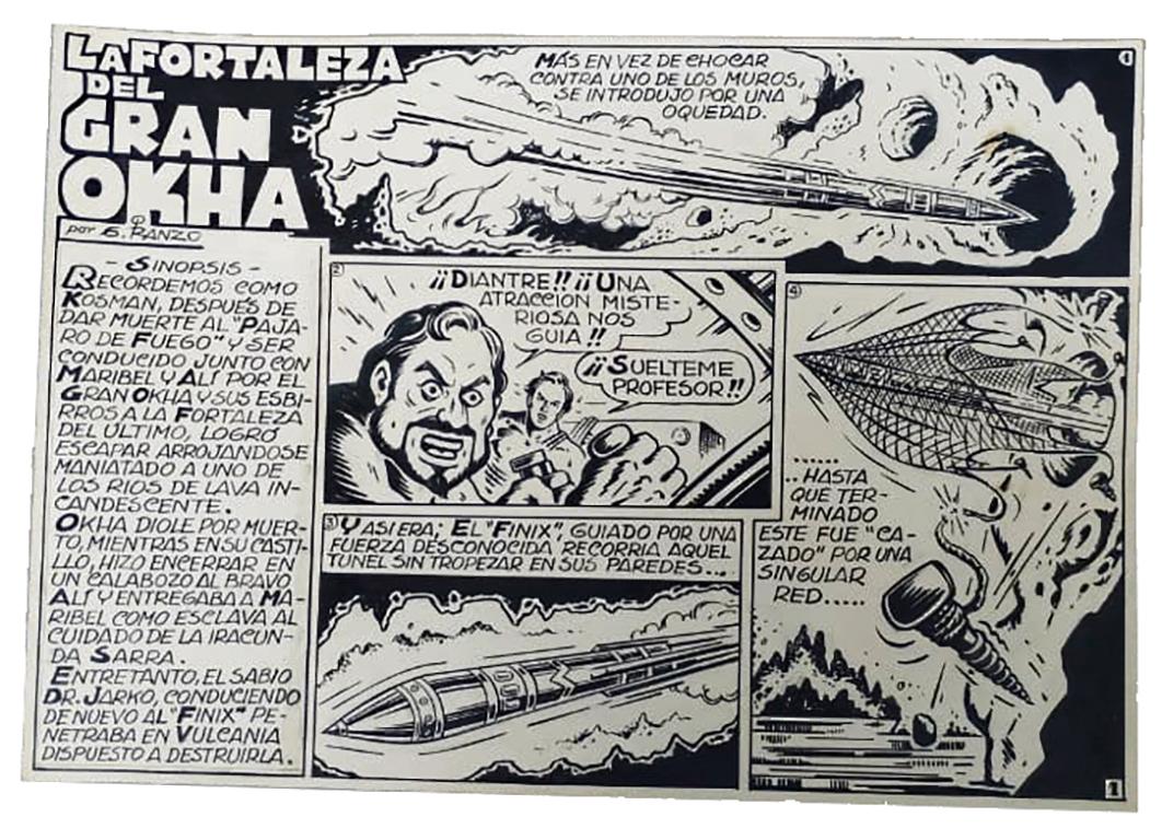 Si em punxen no em treuen sang. Efectivament, va remenar una mica i en va treure el sobre amb les de planxes, inclosa la portada, del capítol 7, La fortaleza del gran Okha. “Kosman, después de dar muerte al Pájaro de fuego y ser conducido junto con Maribel y Alí por el gran Okha y sus esbirros a la fortaleza del último, logró escapar arrojándose maniatado a uno de los ríos de lava incandescente”. Pensin que Iranzo escrivia ell mateix els guions de Kosman. Si m’hagués deixat triar hauria escollit el número 1, és clar, però no m’anava a posar llepafils.