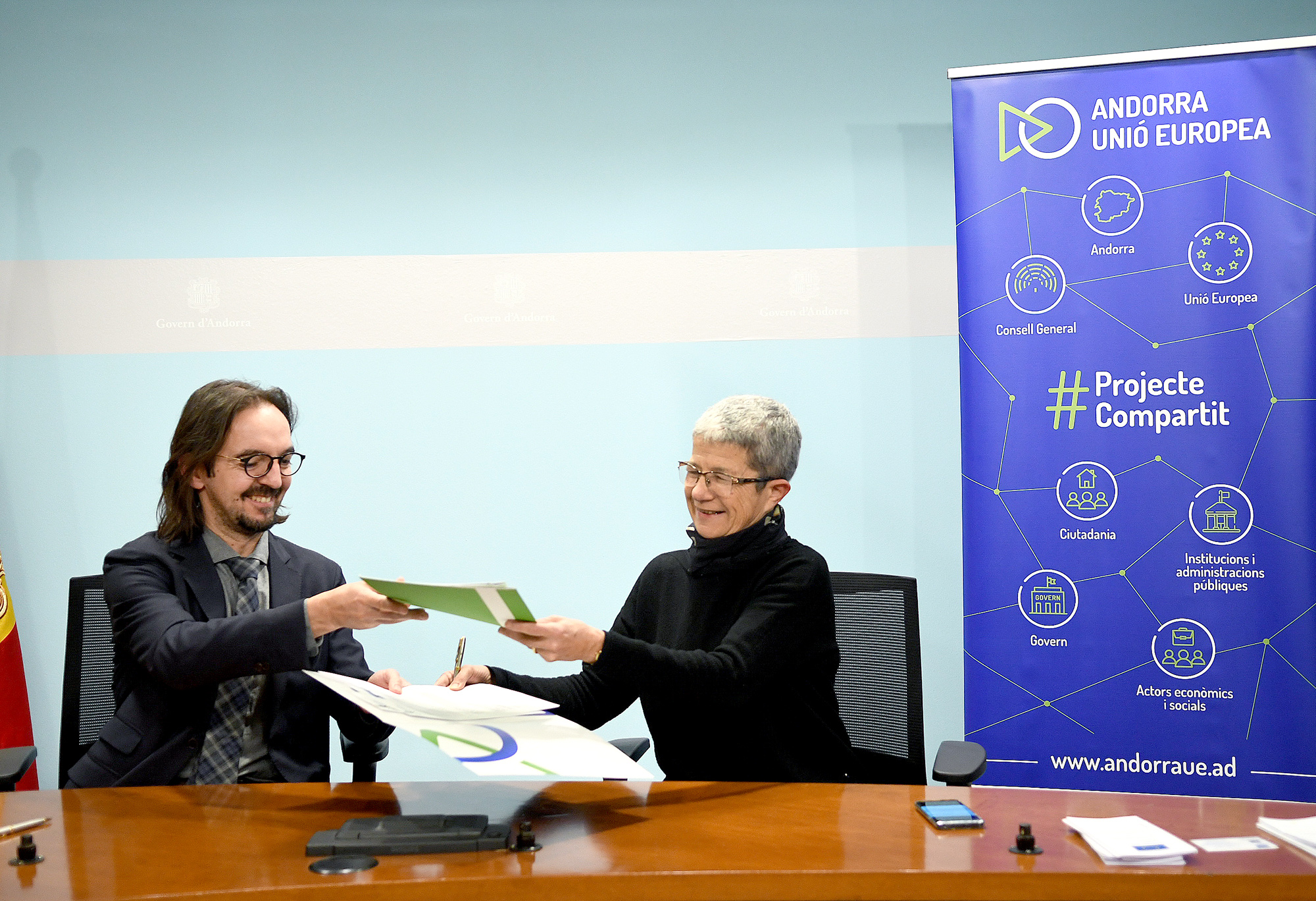 El secretari d’Estat d’Afers Europeus, Landry Riba, ha signat avui un acord amb el Centre d’informació Europe Direct Pirineus que permetrà col·laborar en accions d’informació sobre les polítiques i les institucions europees a Andorra. Per la signatura s’ha desplaçat a Andorra la directora de l’entitat ADRET-centre Europe Direct Pirineus, Claire Sarda-Vergès, situat a Prades.