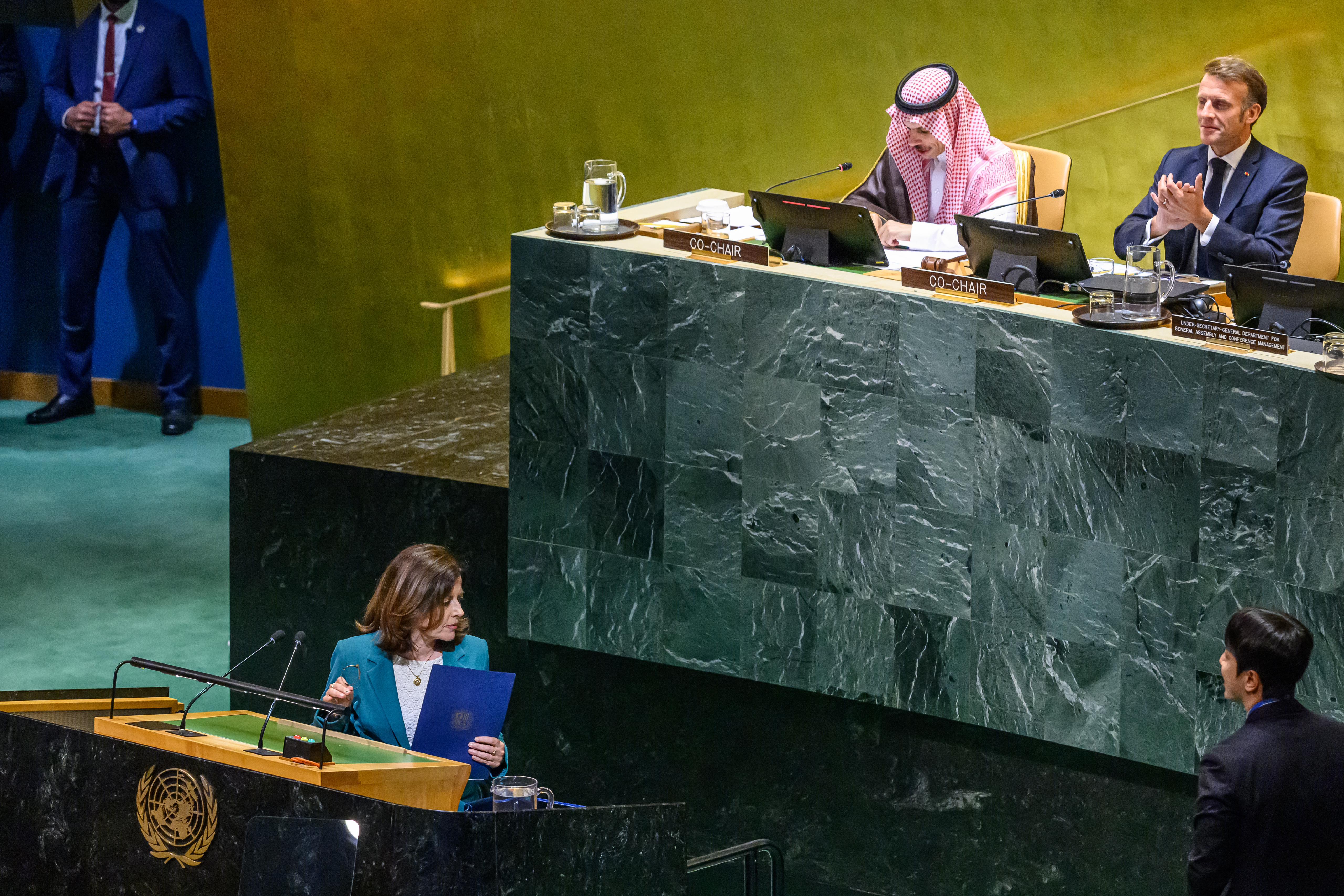 Així mateix, els estats van reafirmar el seu compromís d' adoptar mesures concretes, de conformitat amb el dret internacional i en línea amb les resolucions pertinents de l'ONU i l'Opinió Consultiva del 19 de juliol de 2024 de la Cort Internacional de Justícia, per ajudar a fer efectiu el dret del poble palestí a l'autodeterminació i contrarrestar la política il·legal d'assentaments en el territori palestí ocupat, inclosa Jerusalem Oriental, així com les polítiques i amenaces de desplaçament forçós i annexió".