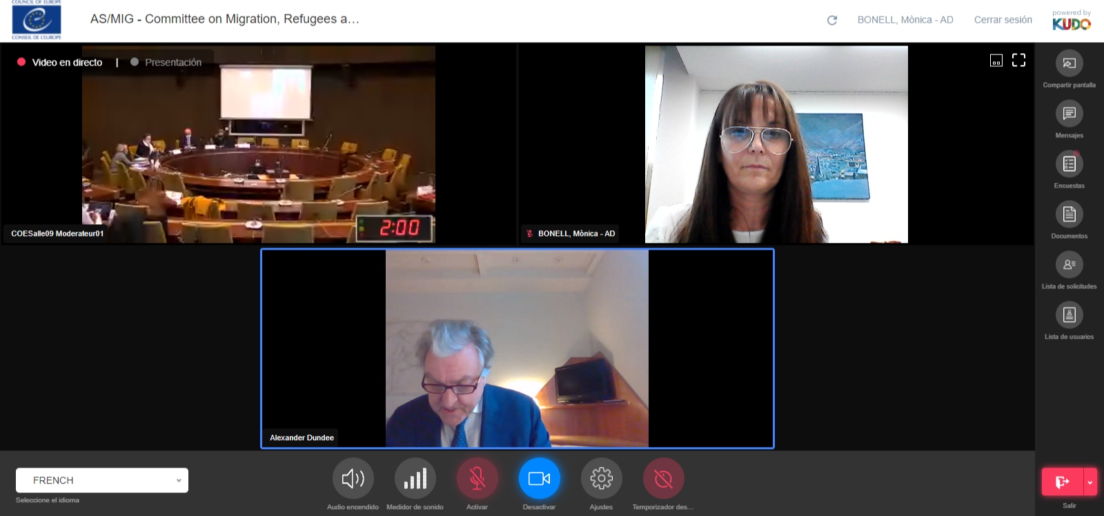 La presidenta suplent del grup parlamentari demòcrata, Mònica Bonell, que exerceix de vicepresidenta segona a la comissió de Migració, Refugiats i Persones Desplaçades de l’Assemblea Parlamentària del Consell d’Europa (APCE), ha presidit avui la reunió que ha celebrat la comissió, en format híbrid (presencial a Estrasburg, i telemàtica). Concretament, Bonell ha gestionat els punts 15, 16, 17 i 18 de l’ordre del dia i ha estat el president de la Comissió, el suís Pierre-Alain Fridez, qui li ha cedit la presidència, després d’haver encapçalat la primera meitat de la reunió.