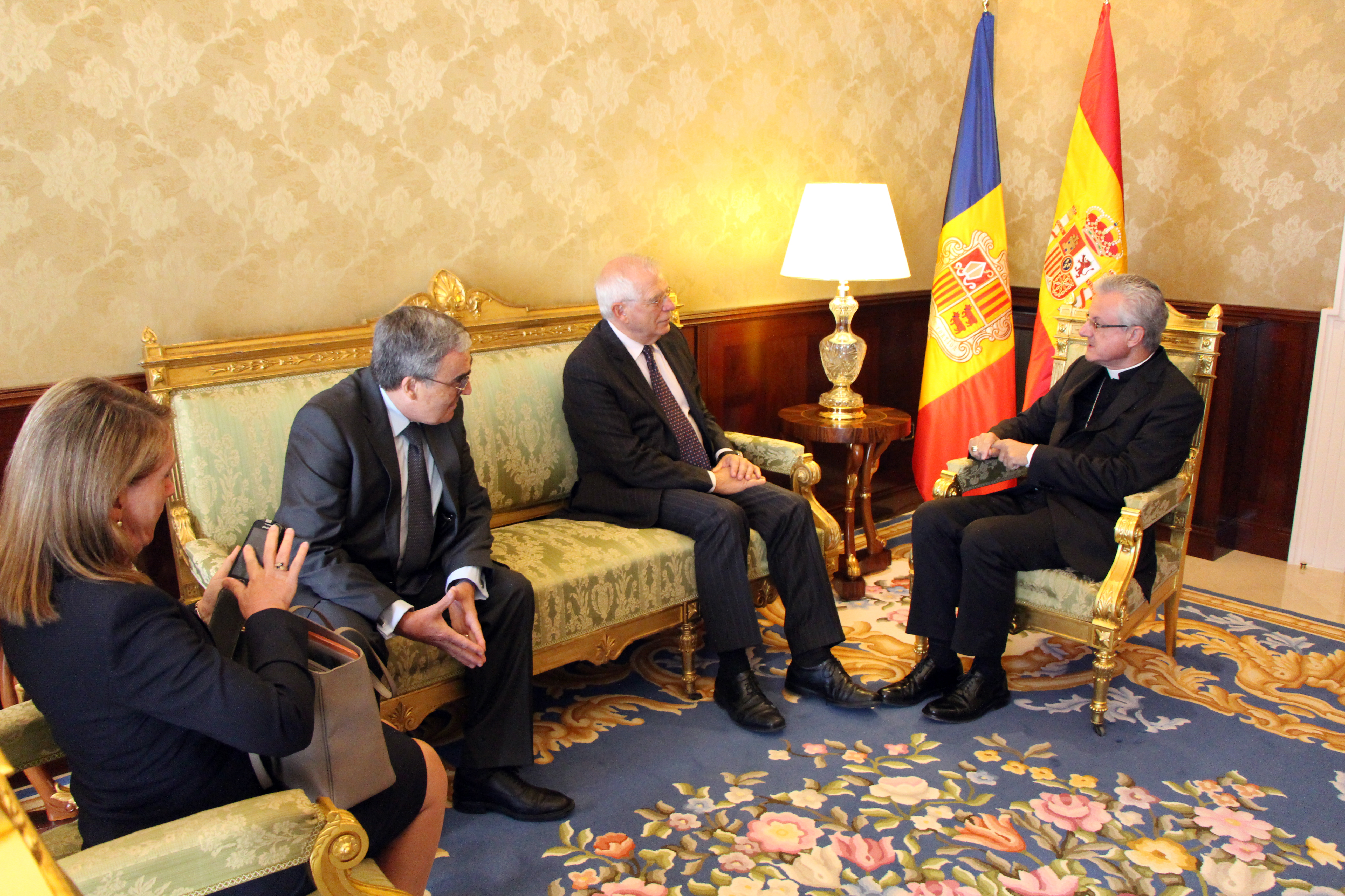 El ministre d'Afers Exteriors, Unió Europea i Cooperació d'Espanya, Josep Borrell, ha tancat la seva visita oficial a Andorra amb una reunió aquest dijous al matí, al Palau Episcopal de la Seu d'Urgell, amb el copríncep Joan-Enric Vives. Durant aquesta trobada, Borrell ha transmès a Vives "la nostra voluntat de cooperar" perquè Andorra assoleixi l'acord d'associació amb la Unió Europea. Mentre que aquest dimecres a la tarda, en declaracions a l'edifici administratiu del Govern, va exposar que el subsidi d'atur entrava dins "les regles del joc" si es vol entrar a Europa, aquest dijous ha matisat que aquest aspecte encara no està tancat i que, des d'Espanya, "ajudarem perquè en aquesta discussió es tinguin en compte les particularitats d'Andorra". "Soc optimista, positiu, crec que els acords acabaran bé", ha confiat Borrell.