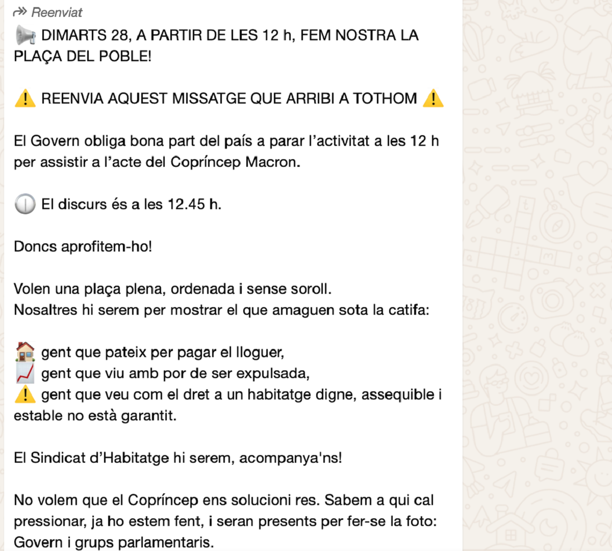 El Sindicat d’Habitatge d’Andorra ha intensificat les últimes hores la convocatòria ciutadana per concentrar-se aquest dimarts a la plaça del Poble coincidint amb l’acte institucional del copríncep francès, Emmanuel Macron. El col·lectiu està fent circular missatges a través de canals digitals i xarxes socials amb una crida explícita perquè la convocatòria “arribi a tothom”.