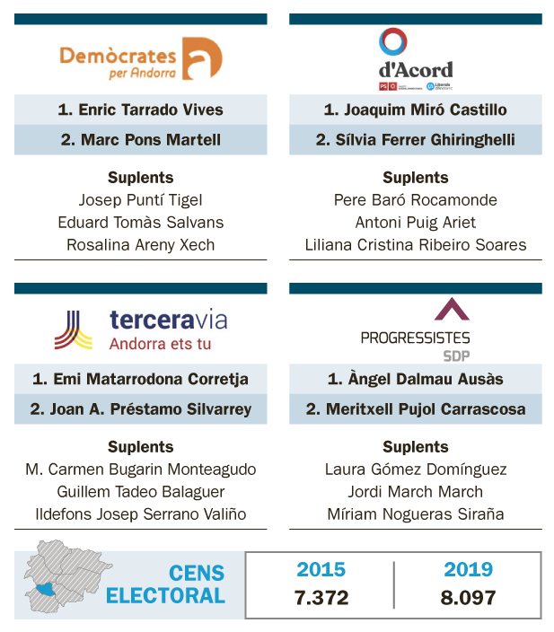 De la seva banda, Progressistes-SDP concorrerà amb Àngel Dalmau i Meritxell Pujol. Jaume Bartumeu, presentador de la llista amb Jordi Pujol, va dir que aquesta és una opció “clara i ferma”, amb coherència en el discurs i que no ha participat en “moviments estranys”. Bartumeu creu que la “dispersió de candidatures” afectarà principalment els partits de centredreta. “Entre ells estan fragmentats, per no dir esmicolats, segons on”, i va recordar que SDP té el seu espai que mirarà d’ampliar. “La nostra és una proposta a favor del país, i no contra ningú” va remarcar. També hi serà Terceravia, amb Emi Matarrodona i Joan-Antoni Préstamo. La cap de llista va afirmar que la candidatura té un “plantejament d’Estat molt ferm i sòlid” i un projecte engrescador que espera que tingui el suport de la gent que està cansada de la manera de gestionar que s’ha fet fins ara. Es tracta de “no fer volar coloms”, va exposar. Tot plegat li fa pensar que les expectatives per a Andorra la Vella seran “fantàstiques”.