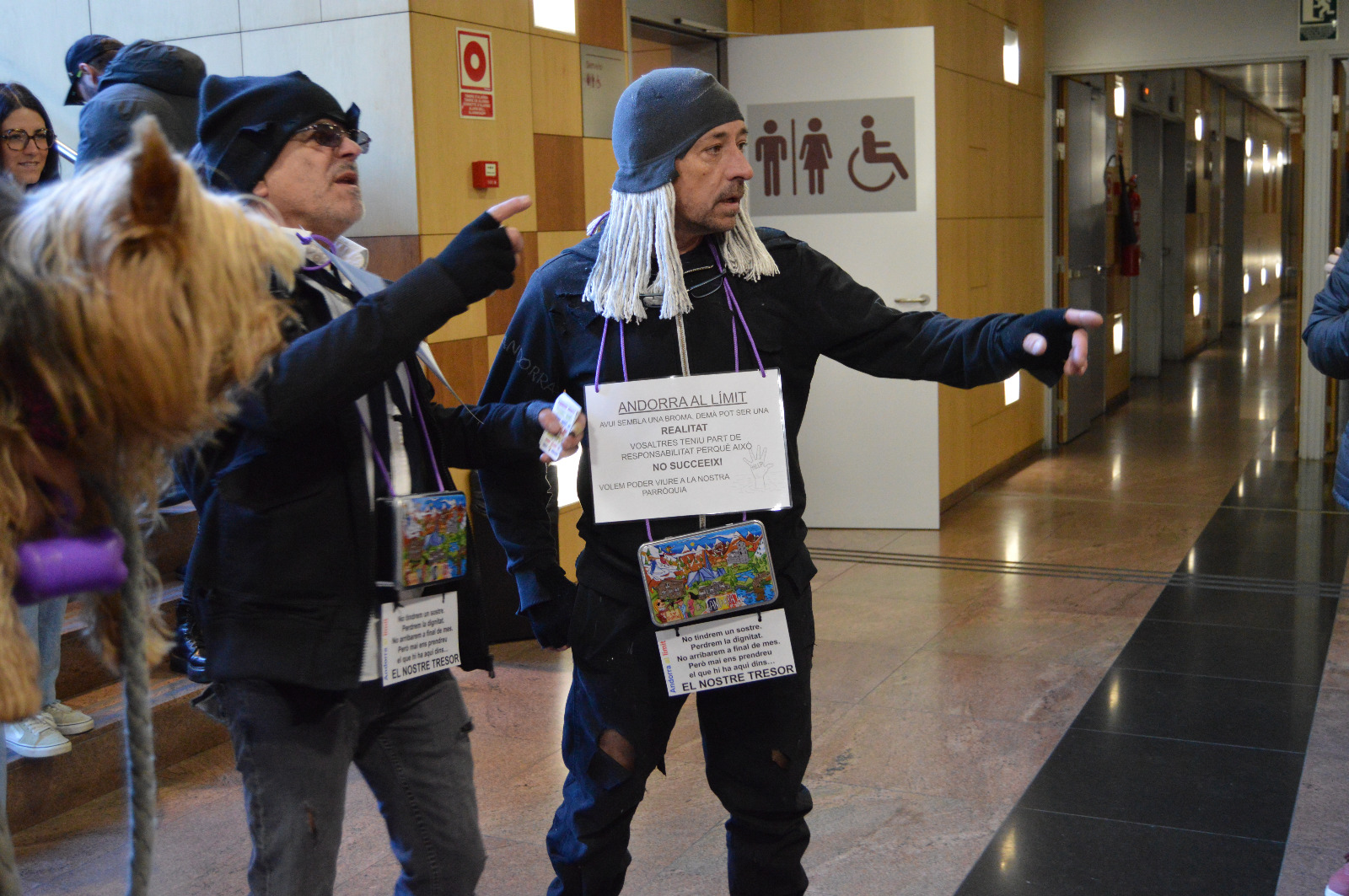 “Avui sembla una broma, demà pot ser una realitat. Vosaltres teniu part de responsabilitat perquè això no succeeixi. Volem poder viure a la nostra parròquia”. Aquest cartell que portaven penjats dos dels impulsors de la plataforma Andorra al Límit, que s'han presentat poc abans de les onze del matí a exercir el seu dret a vot disfressats de rodamons, ha animat, o alterat com ha afirmat un dels interventors de Demòcrates que ha anunciat la presentació d’una incidència, una tranquil·la i gairebé anodina jornada electoral al Centre de Congressos de la capital.