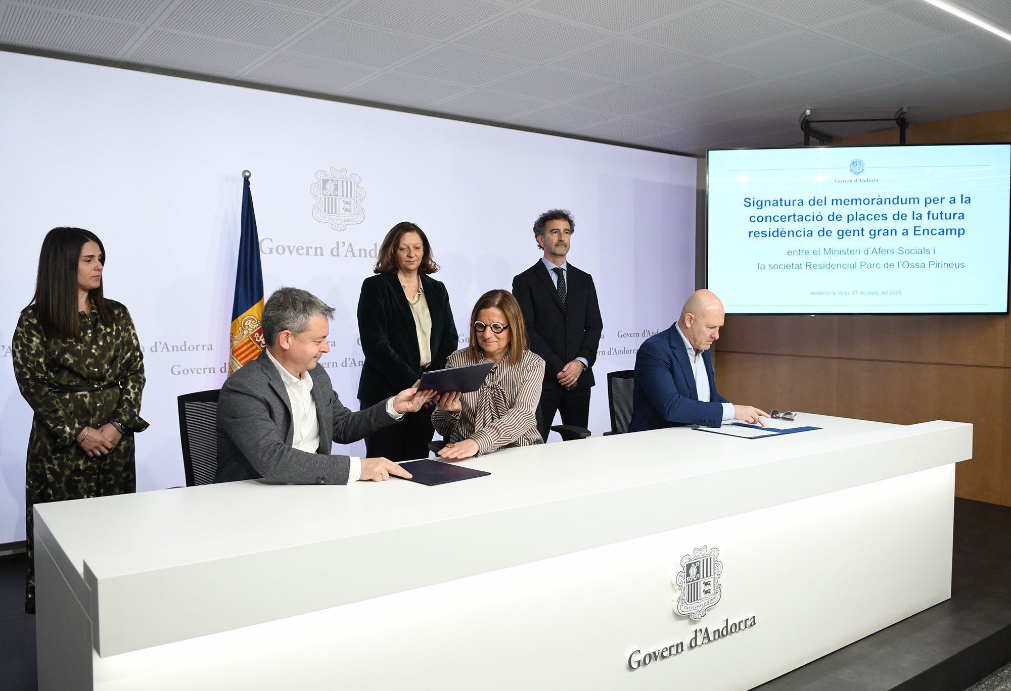 El Govern ha formalitzat la signatura del memoràndum d’entesa amb la societat Residencial Parc de l’Ossa Pirineus, SL per establir les bases de col·laboració en la posada en marxa del centre sociosanitari per a gent gran que promou MoraBanc a Encamp. L’acord preveu la concertació d’entre el 45% i el 55% de les places del futur equipament, un cop aquest entri en funcionament. Això permetrà ampliar el nombre actual de 270 places concertades existents al país amb 66 de noves.
