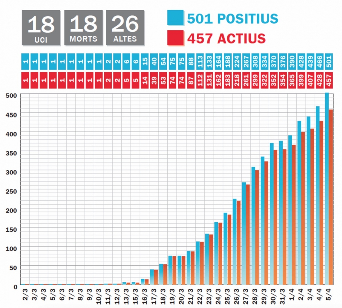 La mort d’un dels pacients ingressat a la unitat de cures intensives ha elevat a 18 el nombre de defuncions per la Covid-19, segons ha explicat aquest migdia el ministre de Salut, Joan Martínez Benazet, que ha precisat que els casos diagnosticats superen ja el mig miler (501).