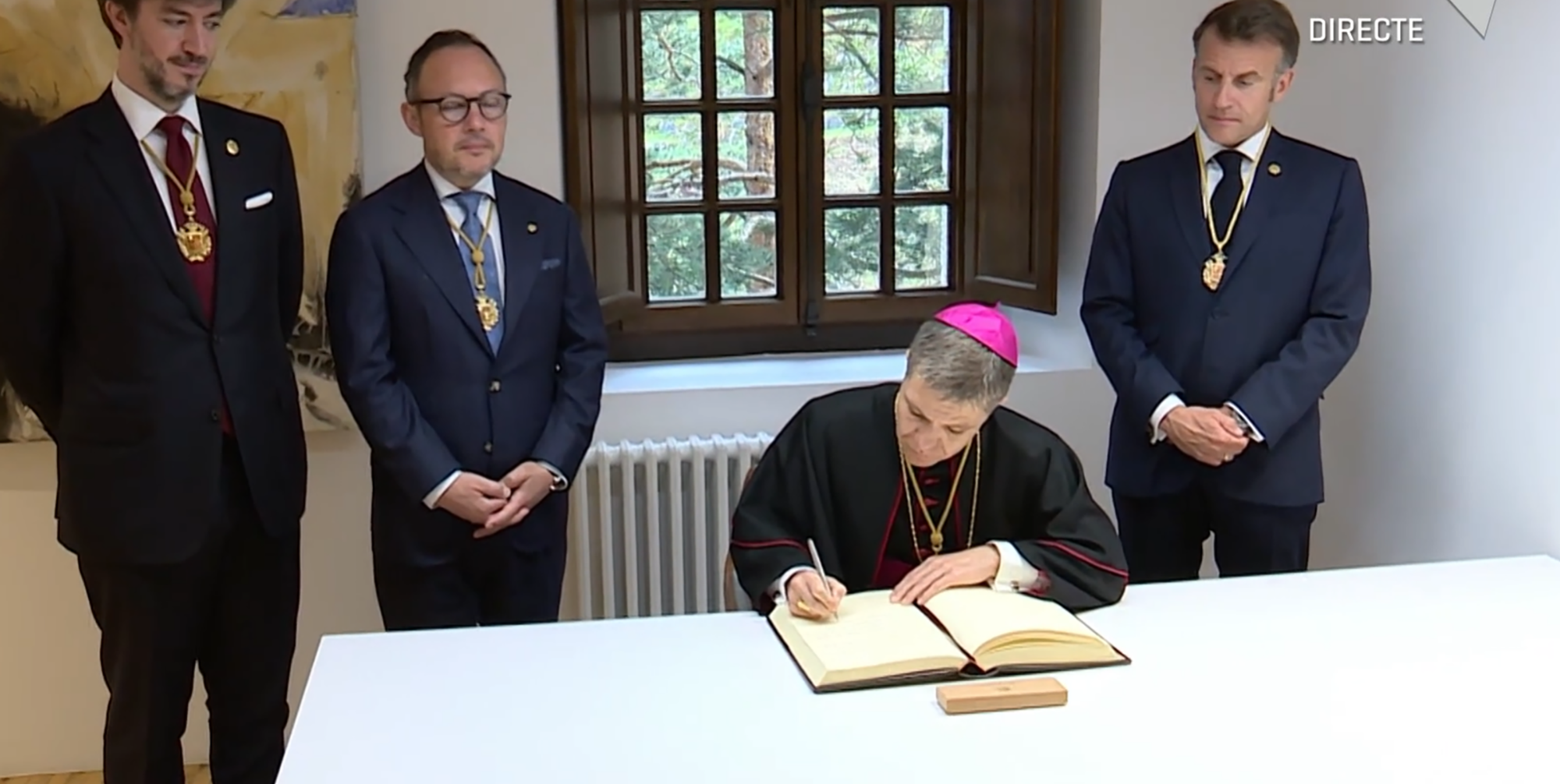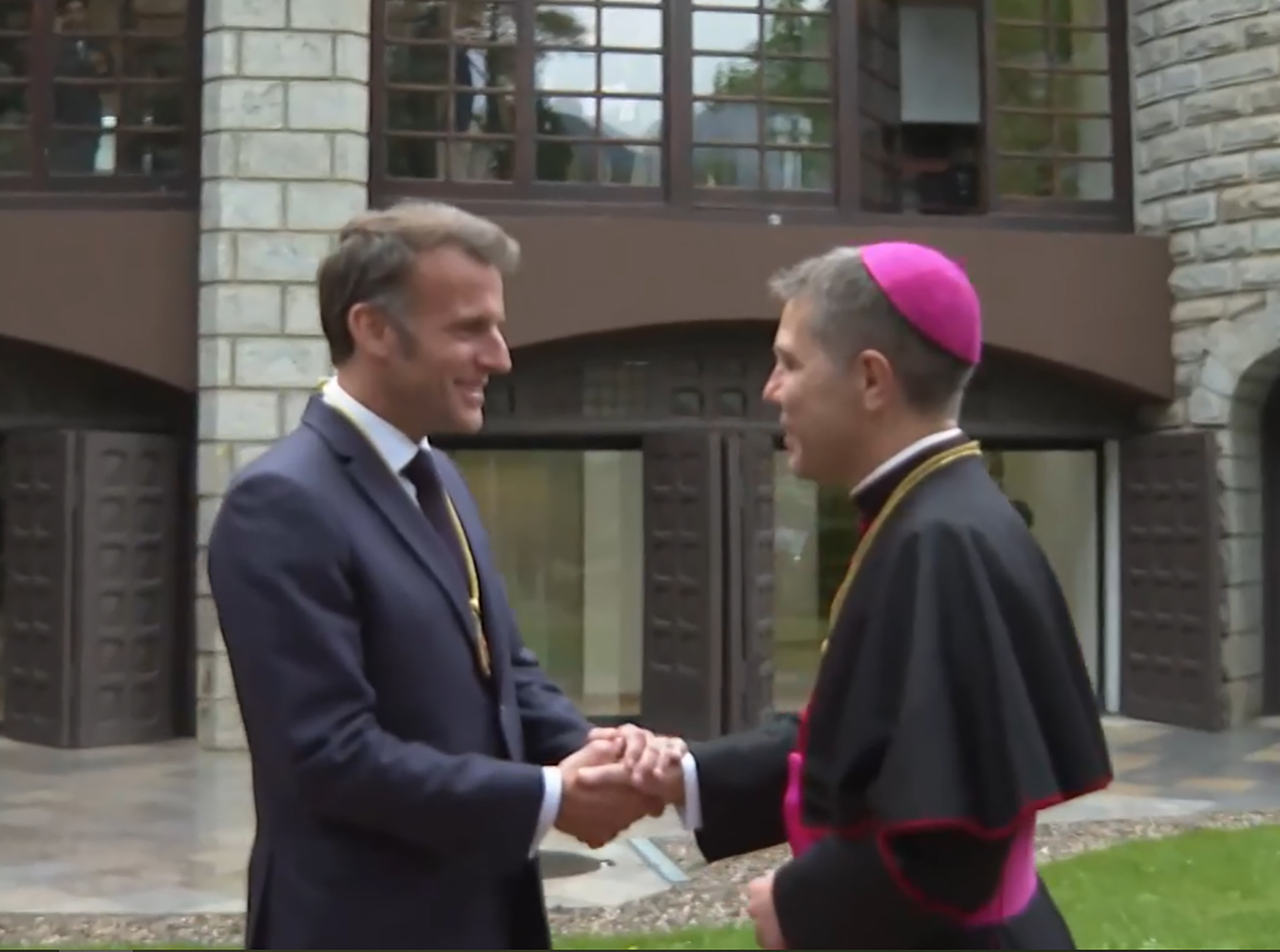 Acabada la reunió entre Macron i Espot, el copríncep francès i el cap de Govern han sortit novament a l'exterior de Ràdio Andorra per esperar l'arribada del copríncep episcopal, Josep-Lluís Serrano, que ha arribat acompanyat del síndic general, Carles Ensenyat.