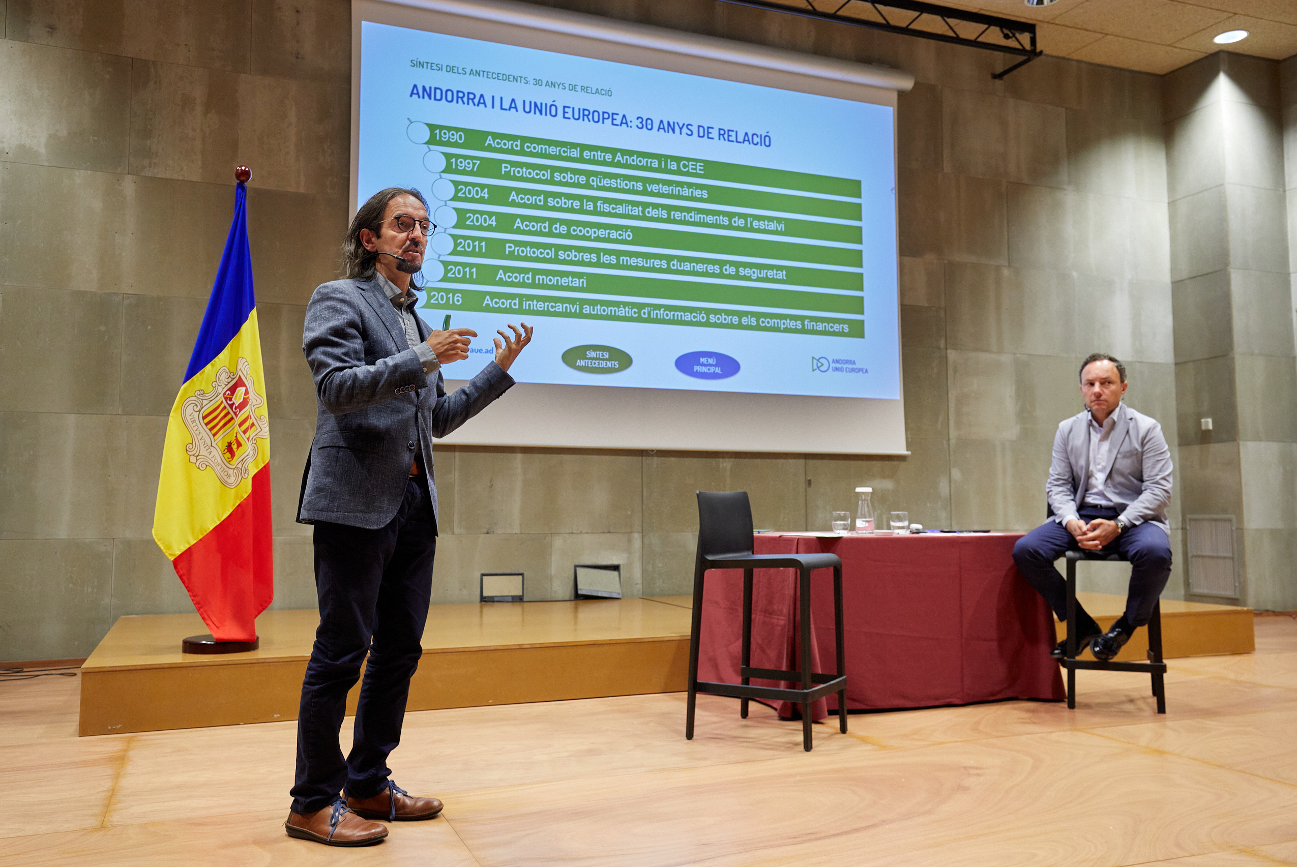 Espot ho ha manifestat minuts abans de començar una trobada amb prop d’una cinquantena de joves que s'an apropat aquesta tarda fins al Centre de Formació d’Aixovall a la xerrada pedagògica sobre els trenta anys de relació d’Andorra amb la Unió Europea. En concret, el cap de Govern, acompanyat del secretari d’Estat d’Afers Europeus, Landry Riba, els han explicat de primera mà la situació actual de l’Acord d’associació i les oportunitats que podria tenir el país en un futur: des de la diversificació de l’economia, que afavoriria nous sectors econòmics i llocs de treball, i més oportunitats laborals i educatives als joves a l’hora de cursar estudis o treballar a l’estranger. “Que tinguin un coneixement profund de què suposa aquesta aproximació amb la UE, però sobretot de cara a estar molt informats, perquè tot plegat ha de culminar en un referèndum vinculant en què els ciutadans acabaran decidint i tenint l’última paraula sobre si volen aquest Acord d’associació i acabi sent vigent i aplicable al nostre país”, ha declarat Espot.