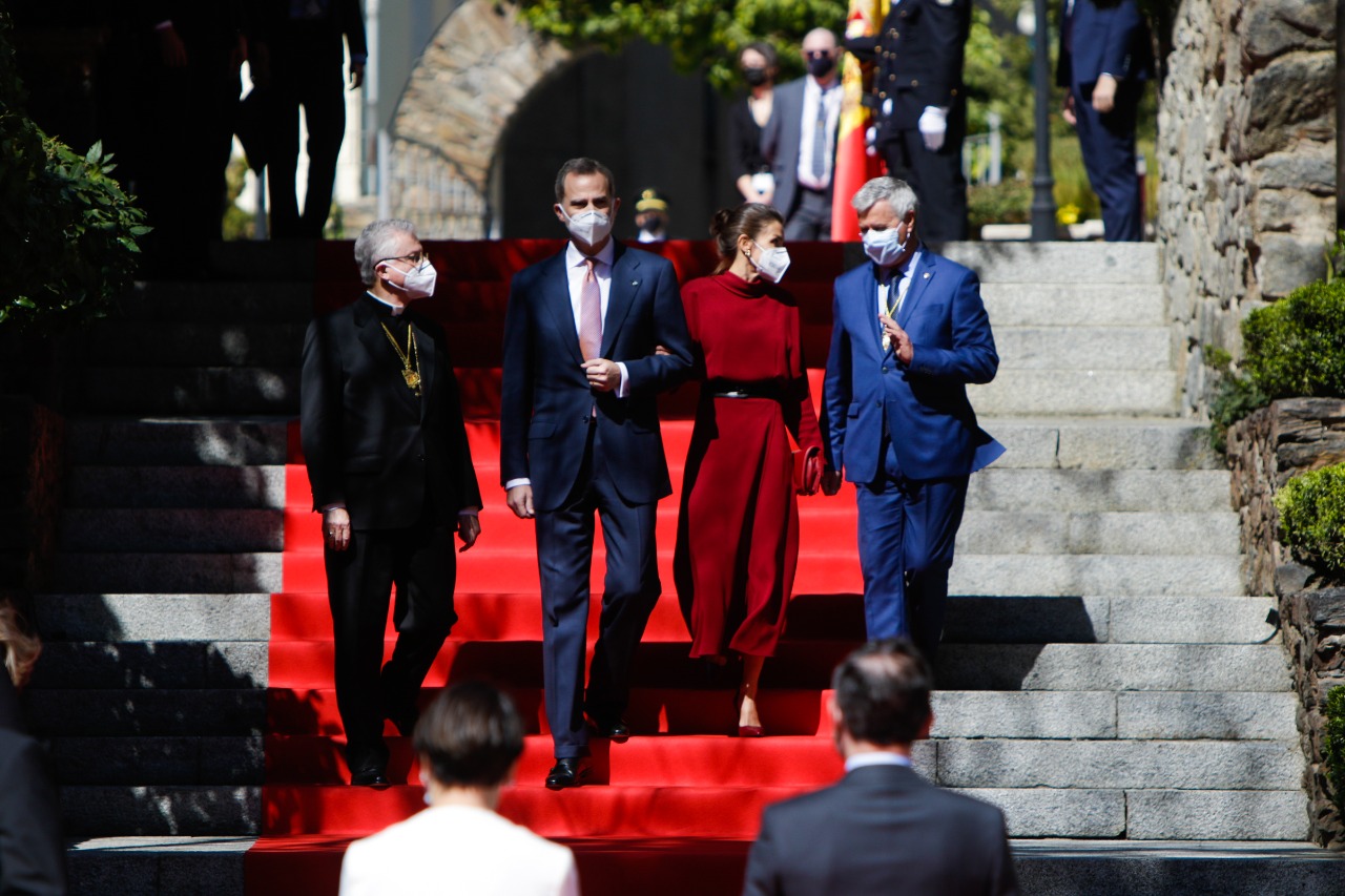Salutació cordial i breu intercanvi de paraules, donant la benvinguda, d’una part, i expressant la felicitat de “ser aquí, finalment”, per l’altra, abans d’escoltar, entre les banderes respectives i davant les mirades dels integrants de les diferents delegacions formant en filera a la plaça, els himnes d’Espanya i d’Andorra. Posteriorment, el monarca a Vives i la reina a Strozda han presentat i saludat un per un els integrants de la delegació espanyola, amb la ministra d’Afers Exteriors, Unió Europea i Cooperació, Arancha González Laya, així com el cap de la Casa del Rei, Jaime Alfonsín, el conseller diplomàtic del rei, Alfonso Sanz, i l’ambaixador d’Espanya al Principat, Àngel Ros, i posteriorment a la inversa amb les autoritats andorranes.