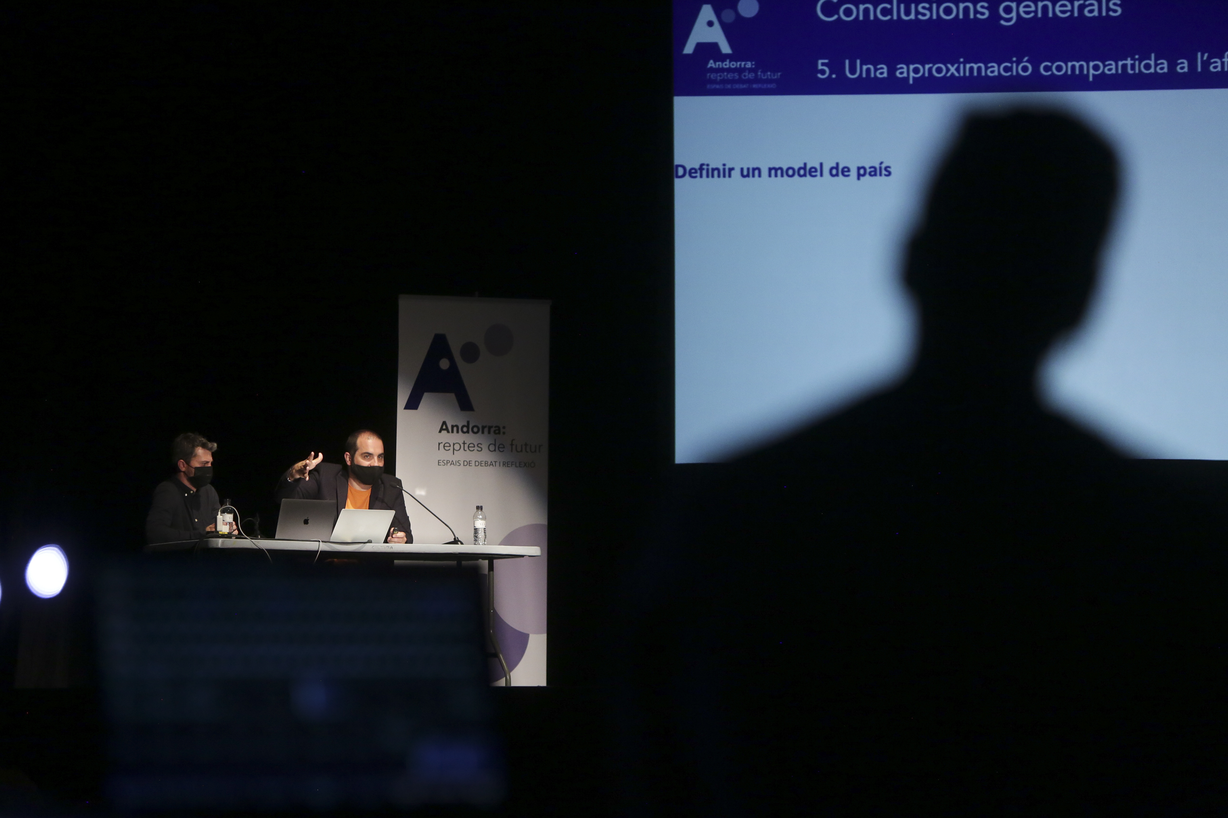 Per la seva banda, Yvan Lara i Marc Pons, com a part de la secretaria tècnica de la iniciativa que ha recaigut en Andorra Recerca+Innovació, van fer un repàs de les conclusions generals que es poden extreure de les cinc taules de treball (relacions internacionals i desenclavament físic; administracions públiques; transició energètica, medi ambient i canvi climàtic; diversificació i transformació econòmica; i salut, benestar i solidaritat), on globalment es va coincidir amb la necessitat de “treballar de manera sistèmica i conjunta, amb una visió global” i també de “forma transversal”.