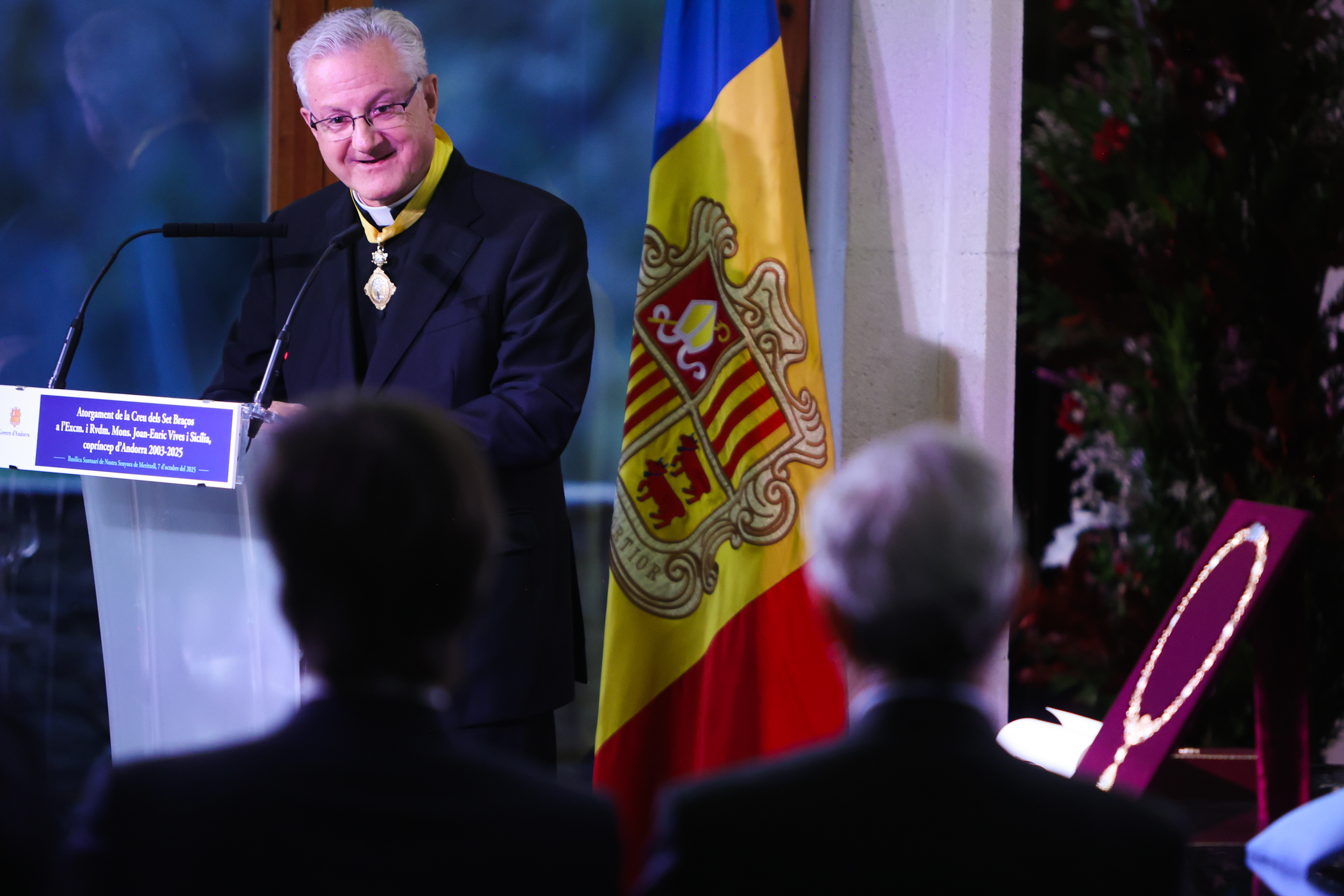 El Govern i el Consell General han escollir aquest vespre el claustre dels Miralls de la Basílica Santuari de Meritxell, que ha quedat petit, per atorgar la Creu dels Set Braços, la distinció de rang més elevat del país, a l’excopríncep i arquebisbe i bisbe emèrit d’Urgell, Joan-Enric Vives, en un acte que s'ha convertit en un doble homenatge, ja que amb el reconeixement a la persona de qui va ser copríncep entre el 2003 i aquest mateix 2025 s'ha volgut homenatjar també el Coprincipat.