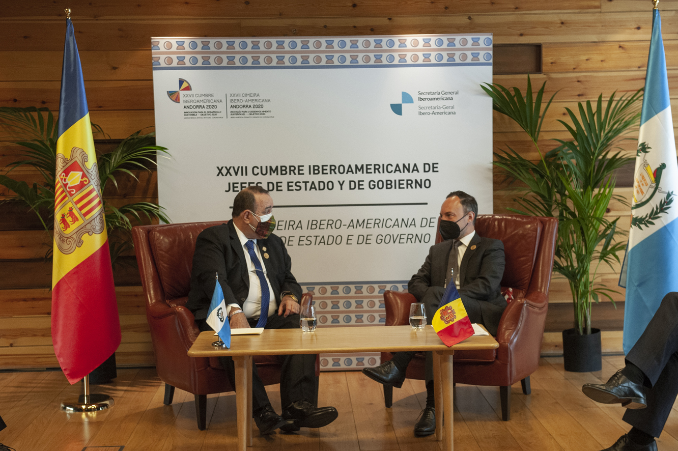 El cap de Govern, Xavier Espot, ha mantingut aquest matí una reunió bilateral a Soldeu amb el president de Guatemala, Alejandro Giammattei, en el marc de la 27a Cimera Iberoamericana de caps d'Estat i de Govern que acull aquesta setmana el Principat.