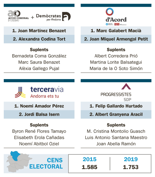 Quatre candidatures es disputen la parròquia d’Ordino. Es tracta de Terceravia+Unió Laurediana+Independents; Progressistes-SDP; Acció Comunal d’Ordino+Demòcrates d’Andorra; i d’Acord (Liberals d’Andorra i el Partit Socialdemòcrata). Un escenari similar al de fa quatre anys, quan també competien pel pastís dels vots quatre forces polítiques. El 2015 també s’hi va presentar ACo+DA, SDP i Liberals, i Junts.