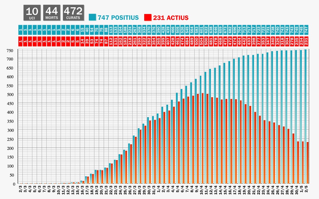 Així, el total de casos de Covid-19 diagnosticats és de 747 que, dels quals se’n mantenen actius 231 tenint en compte les 42 defuncions registrades i que ja hi ha 472 persones que han superat la malaltia, després que en les darreres hores hagin rebut l'alta definitiva 4 malalts. Entre els casos actius hi ha 41 professionals sanitaris, un menys que ahir, i 5 integrants de cossos especials.