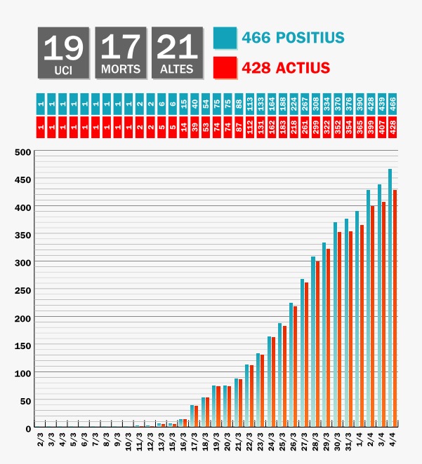 El ministre, que ha trasllat el condol als familiars de la resident d’El Cedre finada ahir a la tarda, ha explicat que hi ha 428 casos actius, entre els quals 93 professionals sanitaris, tres menys que ahir després que s’hagin recuperat, i 19 integrants dels cossos especials. Pel que fa a l’hospital, hi ha ingressades 47 persones, 28 de les quals a planta i 19 a la unitat de cures intensives.