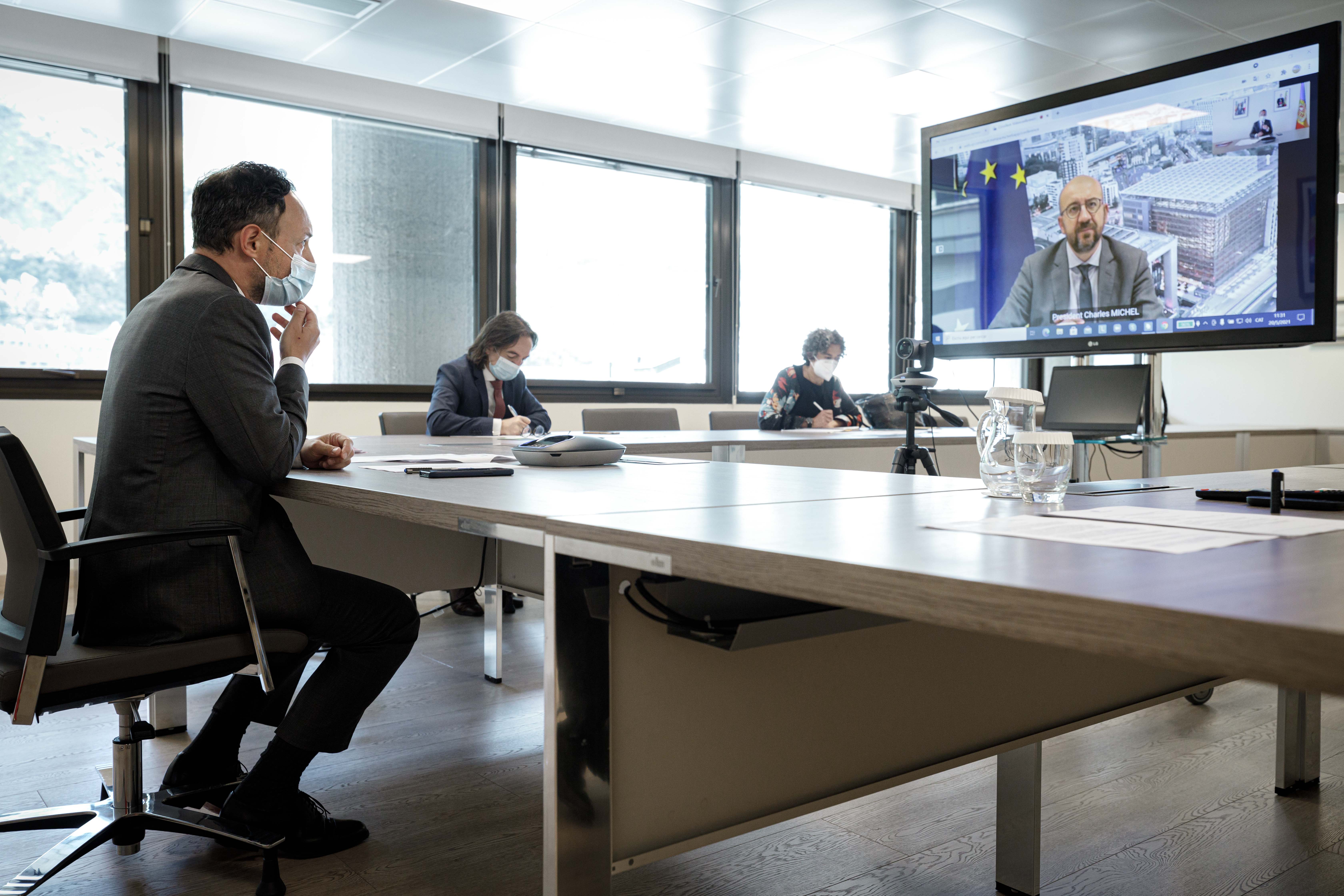 El cap de Govern, Xavier Espot, acompanyat pel secretari d’Estat d’Afers Europeus, Landry Riba, i l’ambaixadora d’Andorra a la Unió Europea (UE), Esther Rabasa, s'han reunit avui telemàticament amb el president del Consell Europeu, Charles Michel, per tractar l’agenda de negociació per a l’Acord d’associació i les relacions d’Andorra amb les institucions europees. Xavier Espot i Charles Michel han expressat la confiança mútua existent i han coincidit en la importància i la necessària col·laboració dels estats membres en el desenvolupament de l’acord d’associació amb la UE.