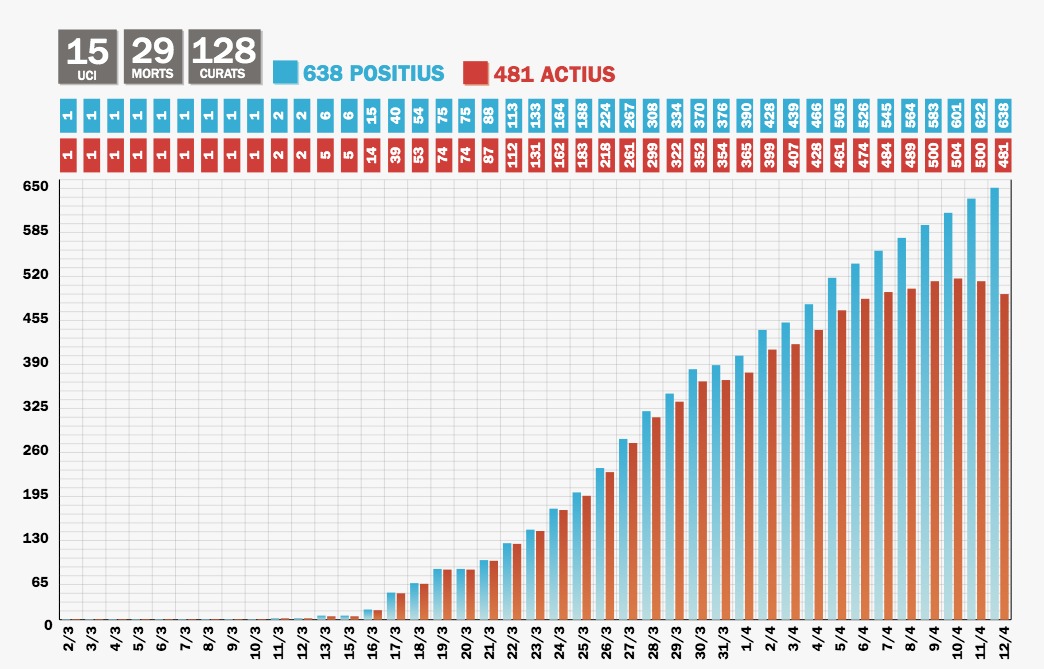 Així, tal com ha detallat el ministre, després de les darreres 98 analítiques que han arribat, el total de casos de Covid-19 diagnosticats és de 638, dels quals se’n mantenen actius 481, 19 menys que ahir, tenint en compte les 29 defuncions registrades i que ja hi ha 128 persones que han superat la malaltia després que en les darreres hores 34 pacients rebessin l’alta definitiva. Entre els casos actius hi ha 71 professionals sanitaris, nombre que “continua baixant”, i 15 integrants de cossos especials.