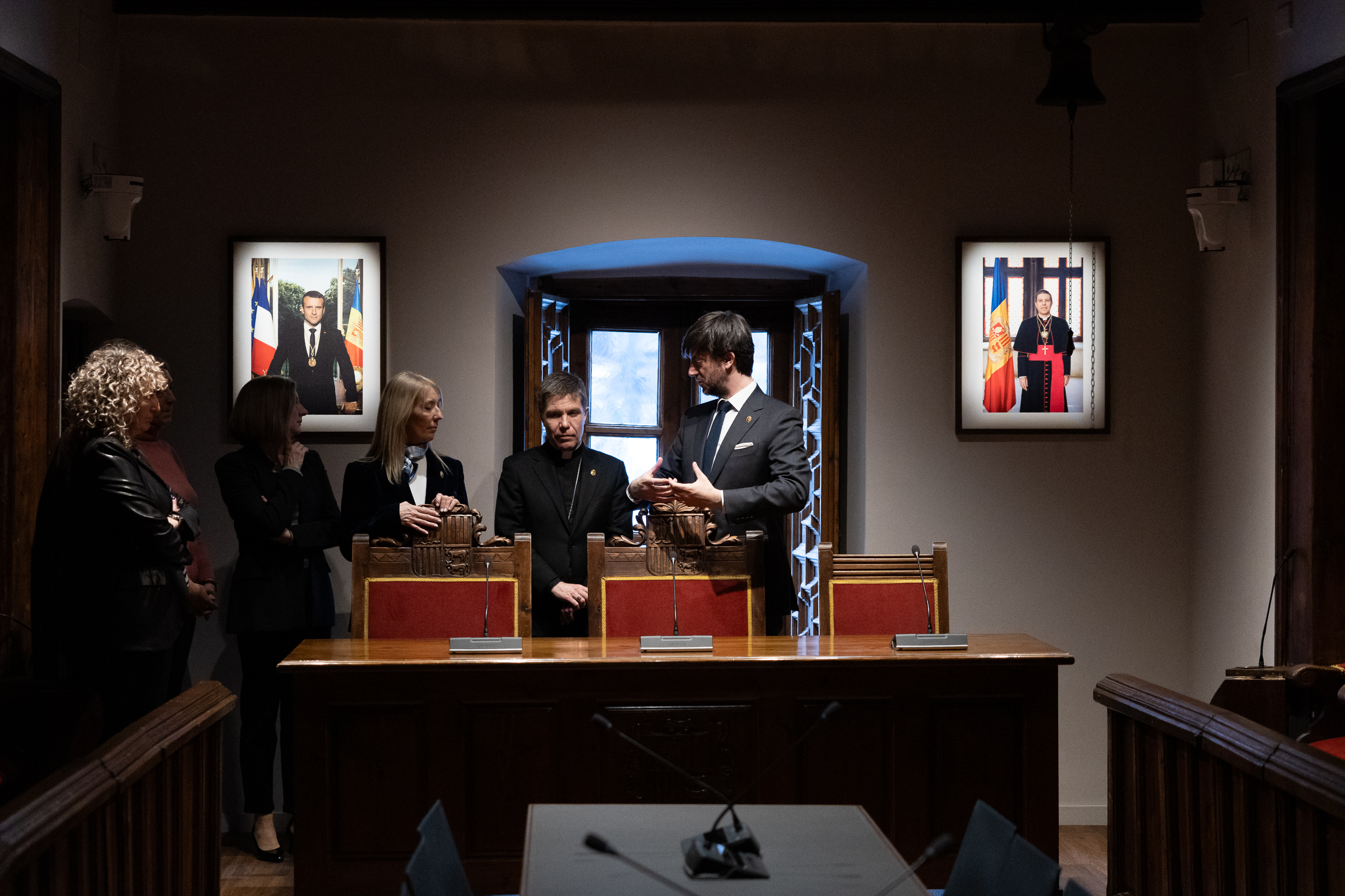 La comitiva també s'ha esplaiat en l'hemicicle de la Casa de la Vall, que recupera la simetria que havia perdut quan Escaldes-Engordany va esdevenir setena parròquia i els quatre escons de més es van sumar tots al costat dret de l'hemicle, vist des del públic.