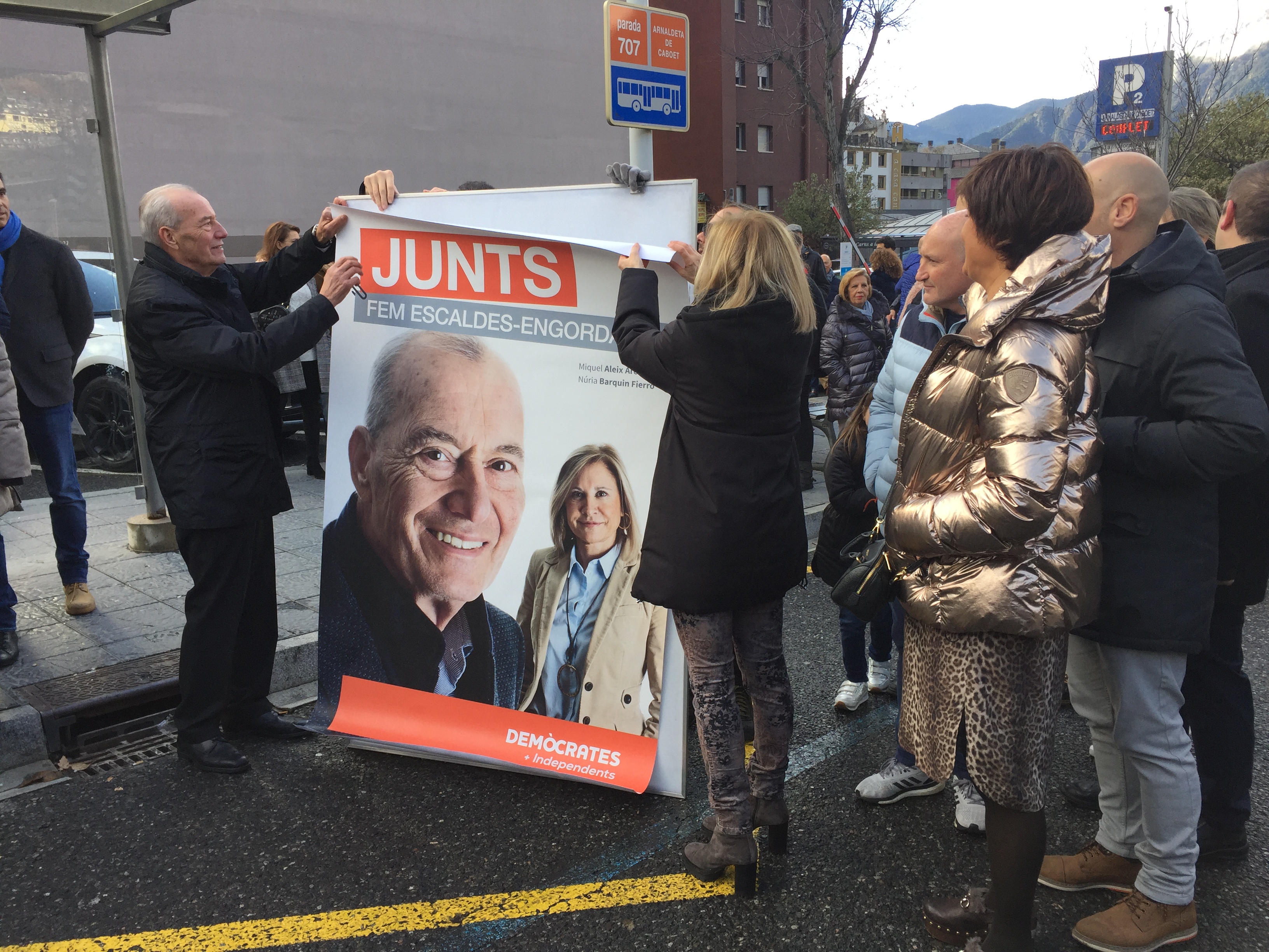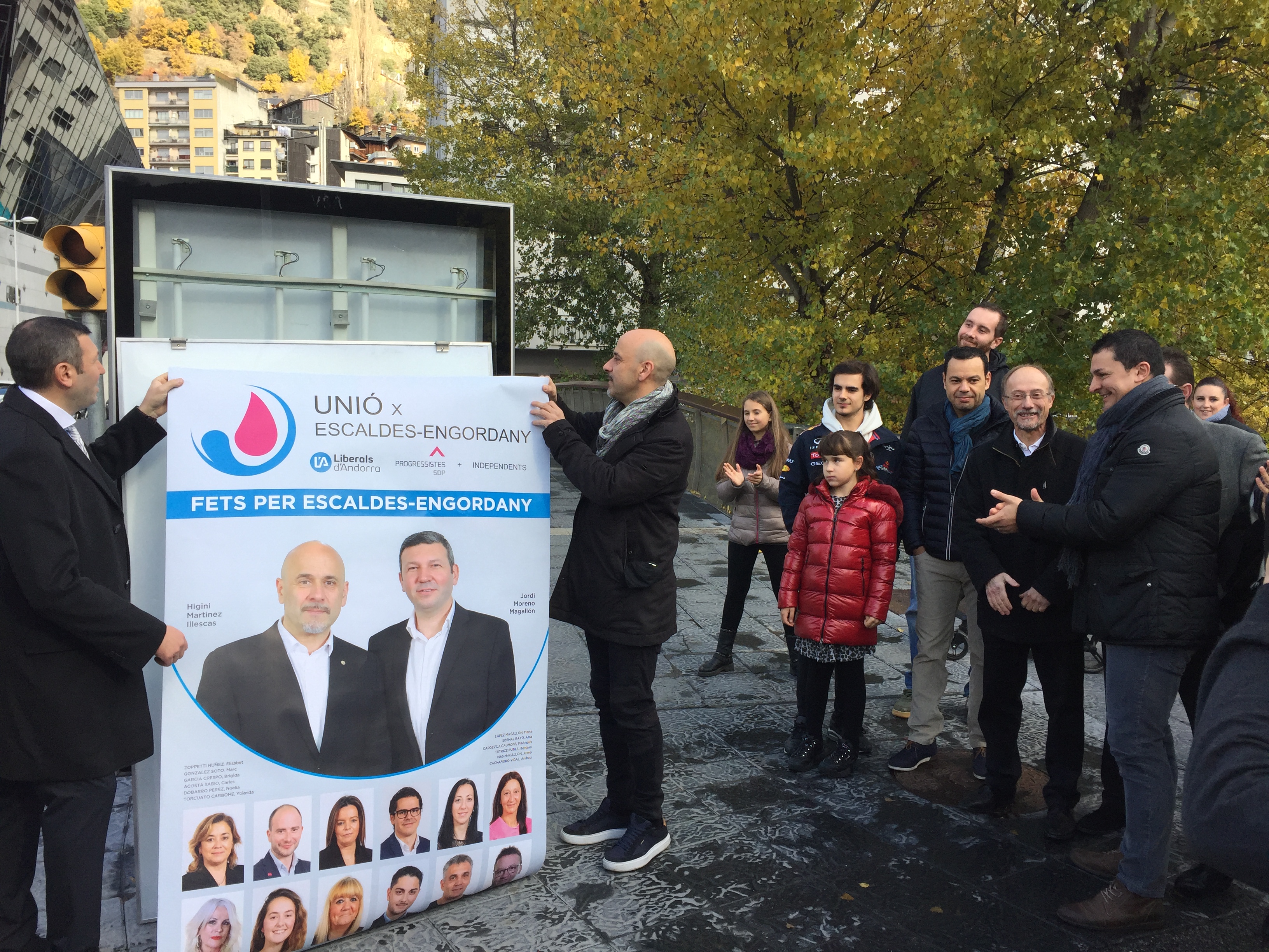 A continuació li va tocar penjar el cartell a Unió x Escaldes-Engordany. La suma de Liberals i SDP va deixar la imatge curiosa de Jordi Gallardo i Víctor Naudi fent costat a la mateixa candidatura. Un grup que, amb Higini Martínez-Illescas al capdavant, promet “fets” i vol treballar en aspectes socials com l’habitatge i d’altra banda, “dinamitzar la parròquia”.