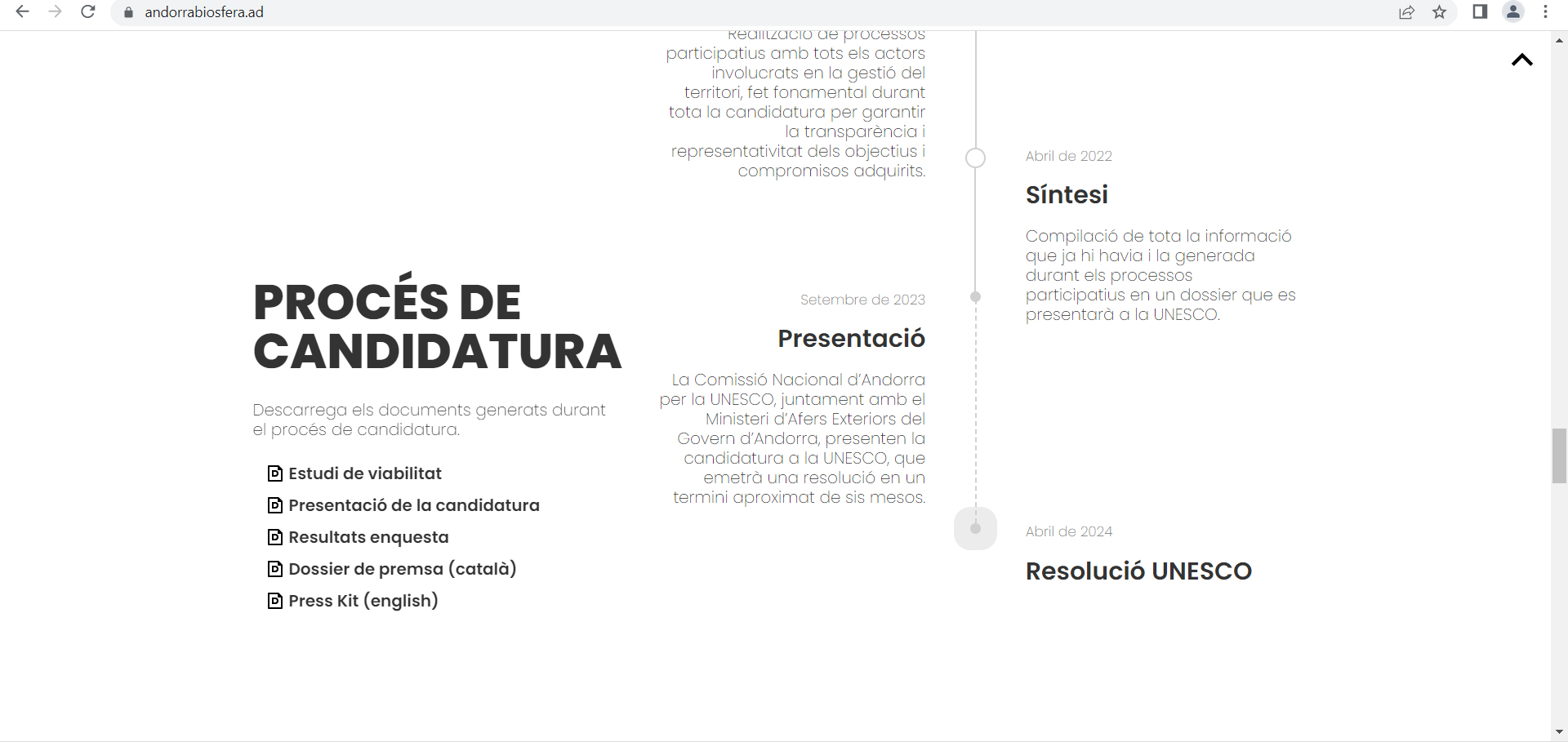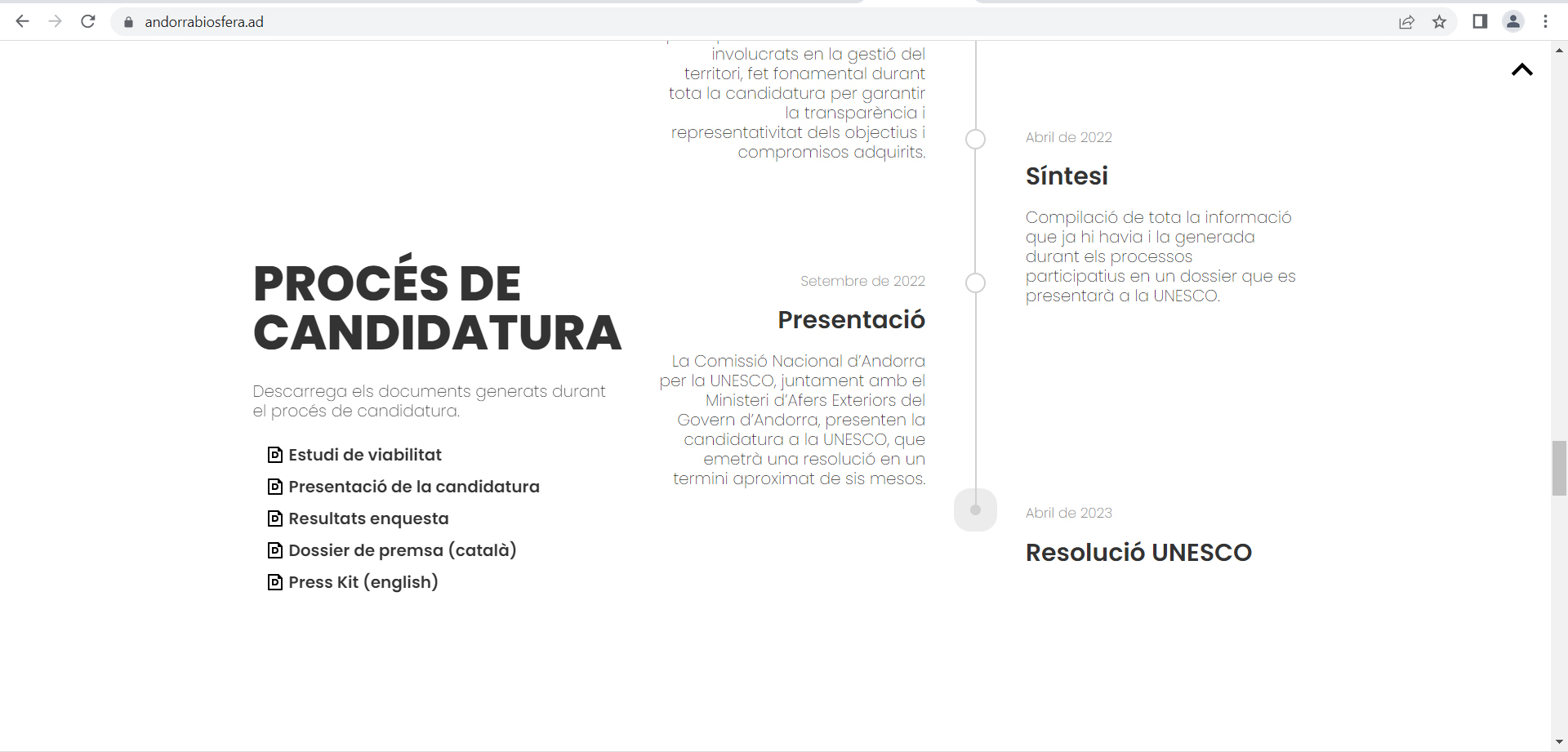 Jordi Gallardo, que ha sortit al pas de les informacions publicades el cap de setmana deixant clar que “el Govern ni ha posposat ni ha renunciat a la candidatura”, ha assegurat que la “candidatura es troba en un molt bon estat”, i ha detallat que dimecres passat es va reunir a París amb la secretària del programa Home i Biosfera de la Unesco, Noéline Raondry, per tractar l’evolució del dossier i dels treballs en curs de la candidatura i informar-la de la voluntat de l’executiu “d’entrar la candidatura abans de final d’any”.