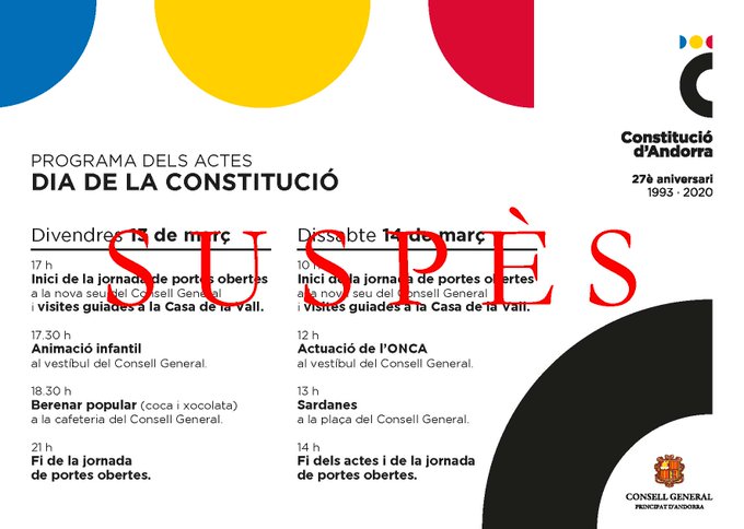 El Consell General ha pres la decisió de suspendre tots els actes relacionats amb la celebració del Dia de la Constitució. Per tant, les jornades de portes obertes d’aquest divendres i dissabte no se celebraran com tampoc el berenar popular que hi havia previst per a aquest divendres. Aquest dissabte tampoc no tindrà lloc el concert de l’ONCA, ni les sardanes ni tampoc la recepció que hi havia prevista a les set de la tarda i en la qual la síndica, Roser Suñé, havia de fer el tradicional discurs del Dia de la Constitució. Tampoc no es farà la tradicional sessió de Consell General.