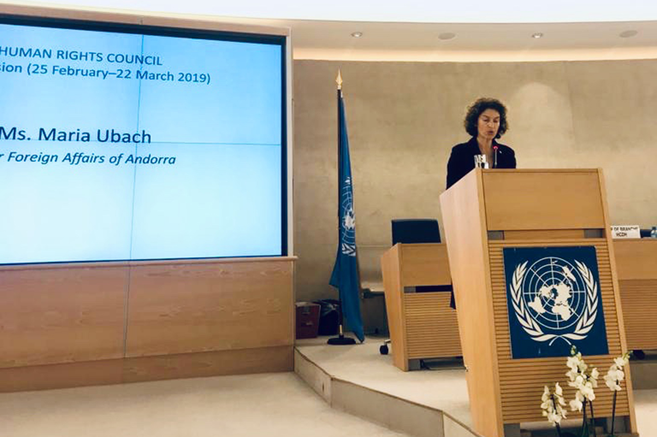 La ministra d’Afers Exteriors en funcions, Maria Ubach, ha defensat durant la seva intervenció davant la comunitat internacional al segment d’alt nivell de la 40a sessió del Consell de Drets Humans, celebrat a la seu de les Nacions Unides a Ginebra, la importància del multilateralisme per aconseguir els objectius de desenvolupament sostenible.