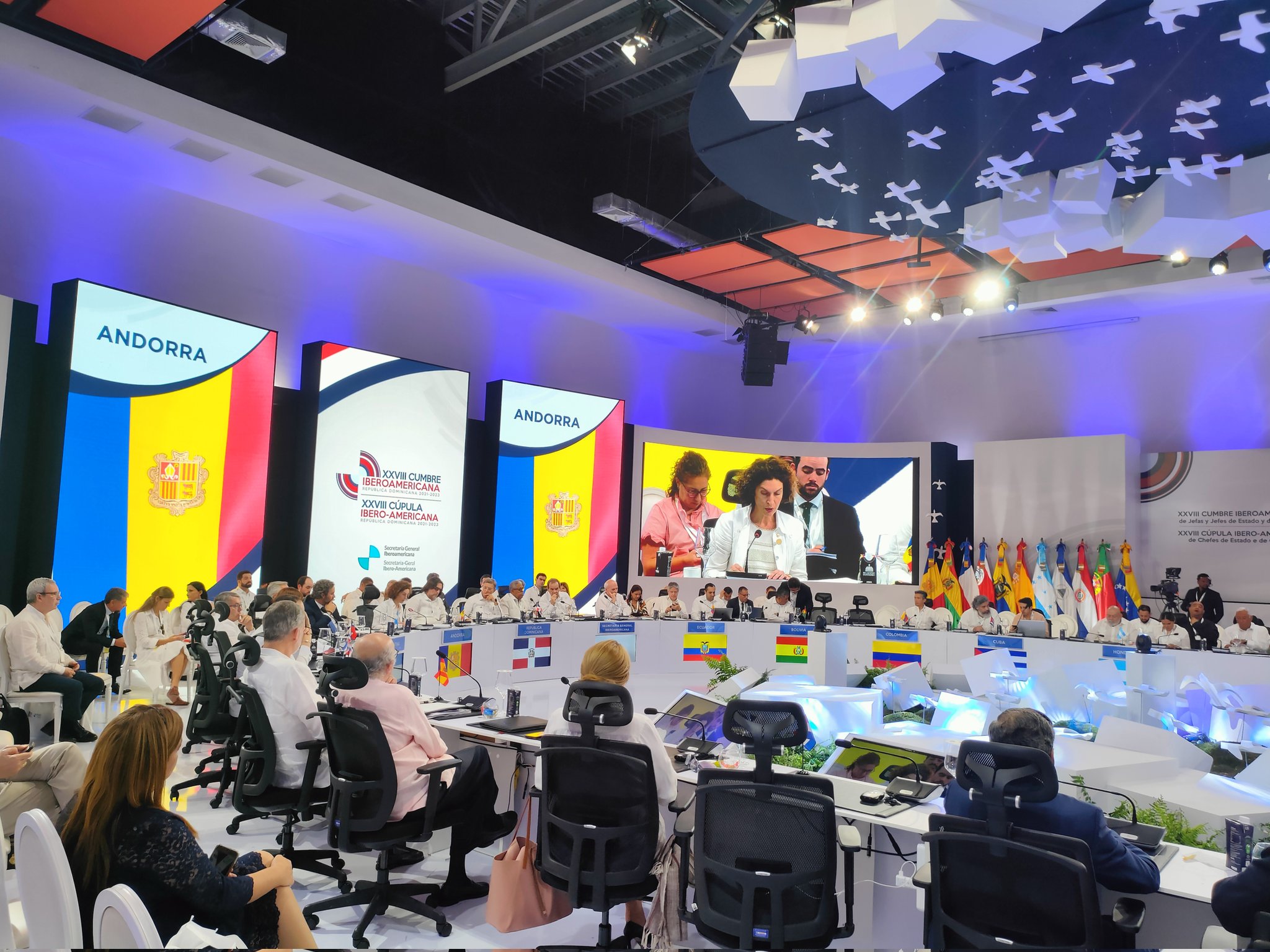 Andorra fa una crida a favor d’una Iberoamèrica més justa i sostenible davant els Caps d’Estat i de Govern de la XXVIII Cimera Iberoamericana La ministra d’Afers Exteriors en funcions, Maria Ubach, en representació del cap de Govern en funcions, Xavier Espot, ha participat aquest dissabte a la reunió plenària de la XXVIII Cimera Iberoamericana de Caps d’Estat i de Govern, que ha estat encapçalada pel president de República Dominicana, Luis Abinader. Ubach ha fet una crida a la cooperació, al diàleg i al suport mutu dels vint-i-dos països de la regió a favor d’una Iberoamèrica més justa i sostenible. La ministra en funcions també ha destacat la importància d’avançar en la protecció de les zones i dels ecosistemes de muntanya davant el canvi climàtic i els seus efectes.