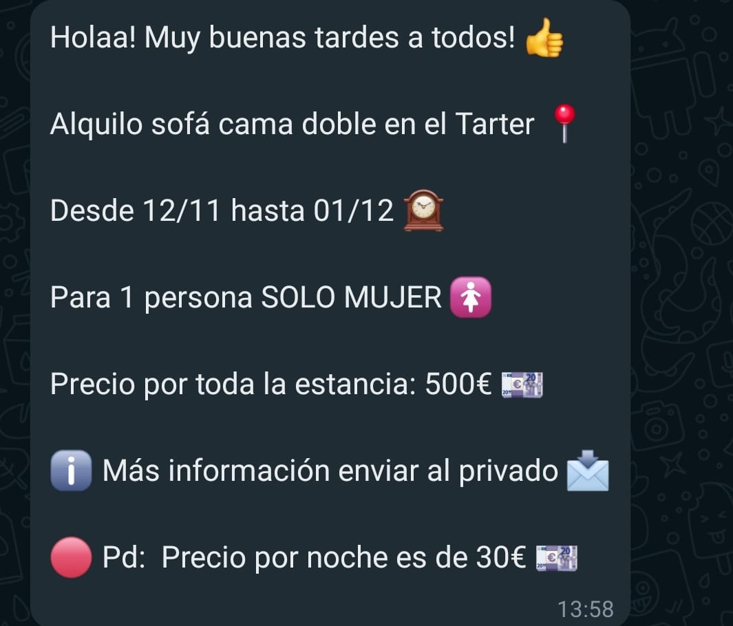 Ja ho han vist: 500 euros per un sofà llit al Tarter on deixar-se caure cada nit. A partir de demà i fins a l'1 de desembre. Aquesta és la ganga publicada avui mateix en un grup de Whatsapp de temporers argentins. Si el preu els sembla per ventura un pelet excessiu, sempre es poden acollir a l'altra modalitat que ofereix el suposat inquilí que relloga un sofà (doble, això sí) a preu d'or: 30 euros la nit. I això, si té sort i és dona. Si no, ni això.