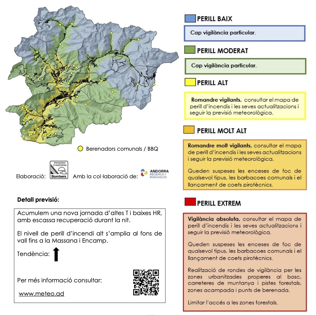 El Cos de Bombers ha activat aquest diumenge l'avís per perill alt d'incendi al centre i sud del país. Un avís que per demà s’amplia i afectarà també al fons de la vall fins la Massana i Encamp. Segons informen a través de les xarxes socials, l'alerta augmentarà al llarg dels propers dies a causa de la presència d'una massa d'aire seca amb altes temperatures que assetja el Principat, i una baixa humitat que es preveu que tingui una escassa recuperació durant la nit.