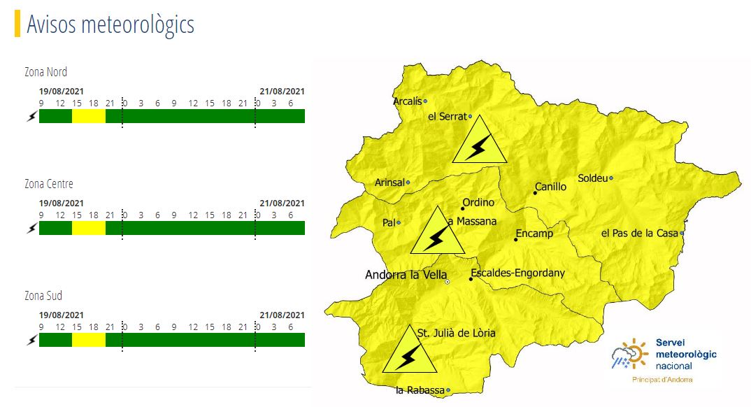 El Servei Meteorològic d'Andorra activa l'avís groc per tempestes a partir d'aquest dijous a la tarda. Segons informen a través de les xarxes socials, un petit embossament d'aire fred en altura aportarà inestabilitat al país, contribuint a la formació de tempestes que es traslladaran de nord a sud. De cara a aquest divendres, però, la previsió és que una nova dorsal anticiclònica torni a fer pujar les temperatures deixant un dia ben assolellat.