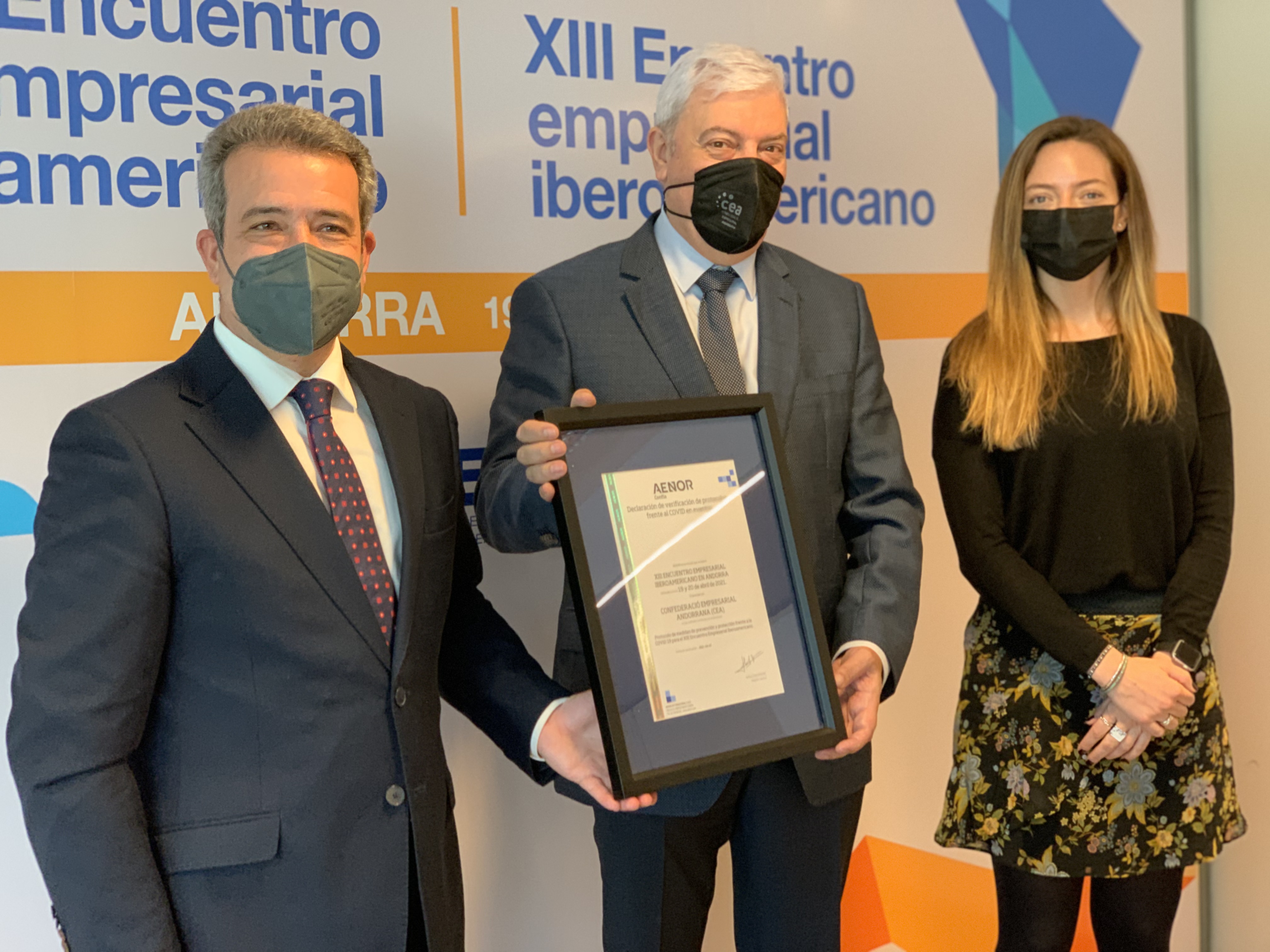 El president de la Confederació Empresarial Andorrana (CEA), Gerard Cadena, ha rebut avui, de mans del director de la Regió Mediterrània d’AENOR, Ángel Luís Sánchez, la declaració de verificació de protocols davant la Covid-19 per a esdeveniments, que lliura l'Associació Espanyola de Normalització i Certificació (AENOR).
